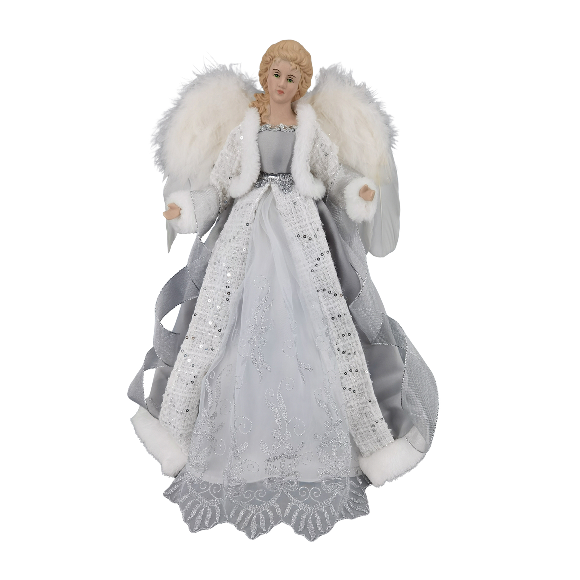 This exquisite figurine captures the ethereal beauty of a Christmas angel, draped in a gown of shimmering silver and adorned with intricate lace details. Her soft, white faux fur accents evoke a sense of warmth and reverence, making her a cherished addition to your holiday display, symbolizing hope and peace during the festive season.