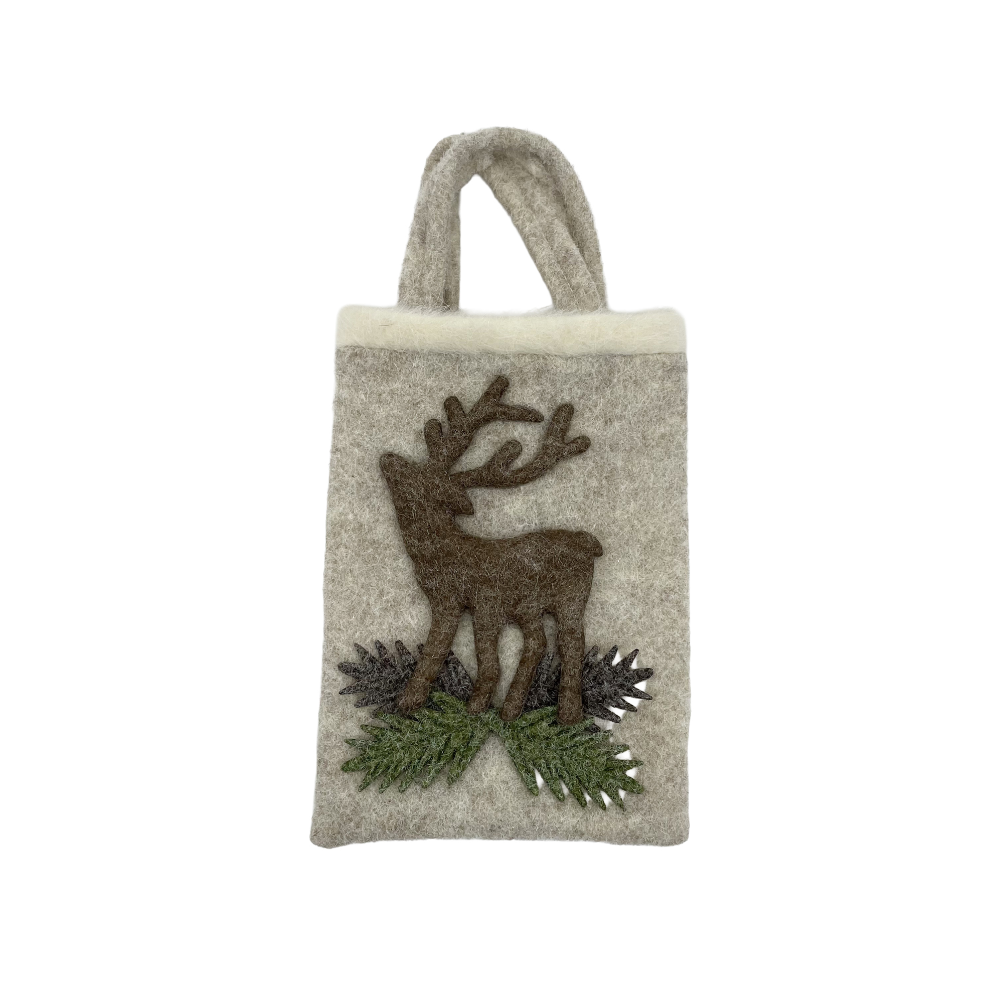 This charming gift bag captures the essence of the holiday season with its soft, felted texture and delightful reindeer motif. Adorned with evergreen accents, it evokes warm memories of winter gatherings and gift-giving traditions, making it a perfect vessel for your heartfelt presents.