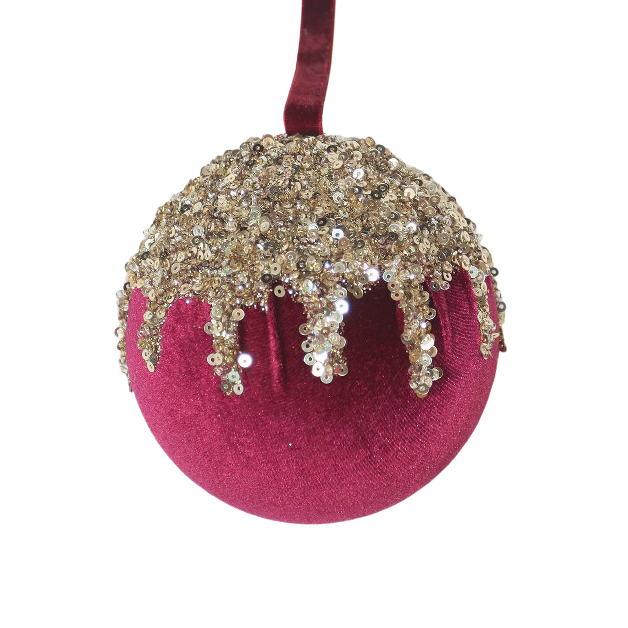 Adorned in rich, velvety crimson, this ornament evokes the warmth of cherished holiday gatherings. The elegant golden sequins cascade like frosted icing, capturing the spirit of festive indulgence and family traditions. A timeless piece, it is lovingly crafted to bring nostalgia to your holiday display.