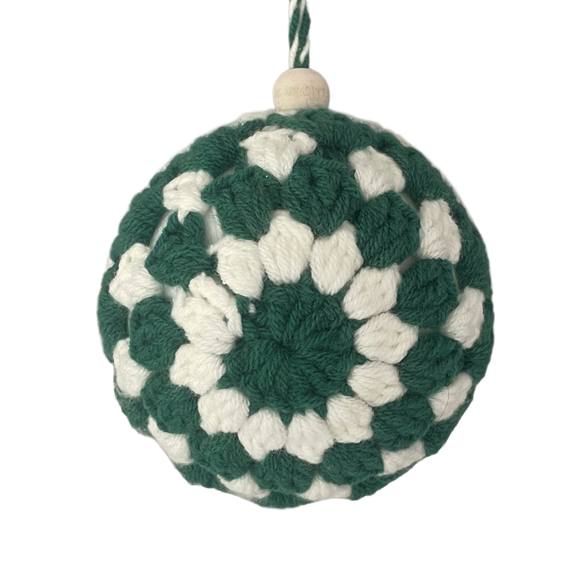 This charming ornament evokes the warmth of home-spun holiday traditions, crafted with a delightful knit pattern of rich green and soft white yarn. The meticulous craftsmanship and soft texture embody the nostalgia of a simpler time, perfect for adorning your tree or adding a cheerful accent to seasonal displays.