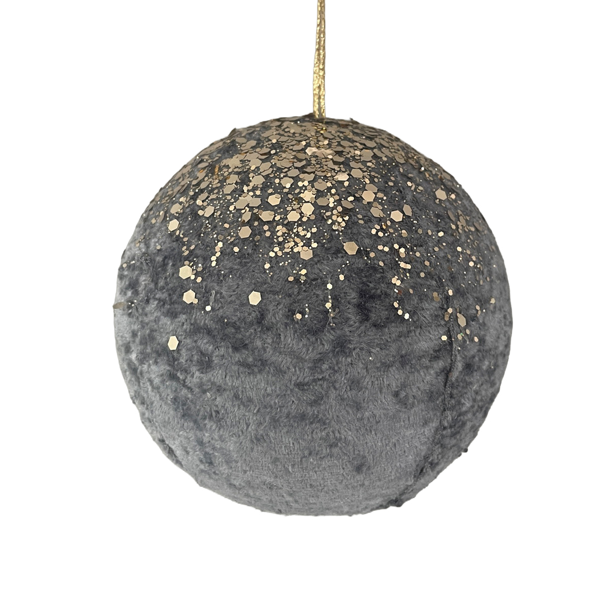 This exquisitely crafted ornament brings a touch of warmth and elegance to your holiday tree. Adorned with a shimmering cascade of golden accents, its plush gray fabric evokes delightful memories of winter evenings spent by the fire. A timeless piece, it will surely become a cherished part of your familys holiday traditions.
