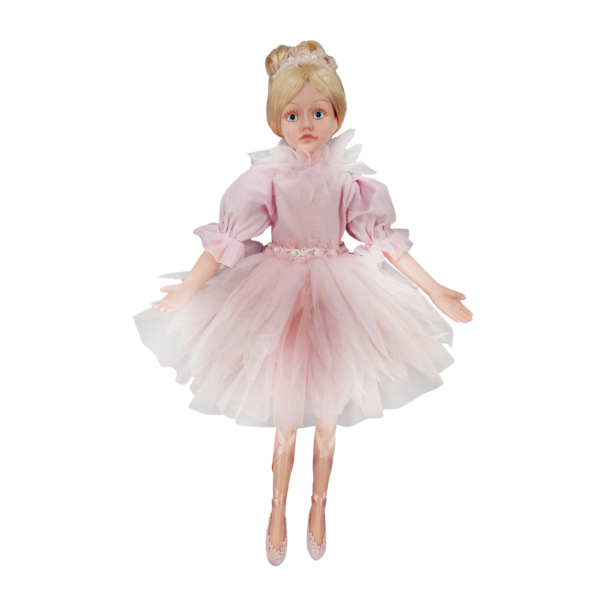 • Features delicate accents, including a satin ribbon around the waist, enhancing her traditional ballerina charm.