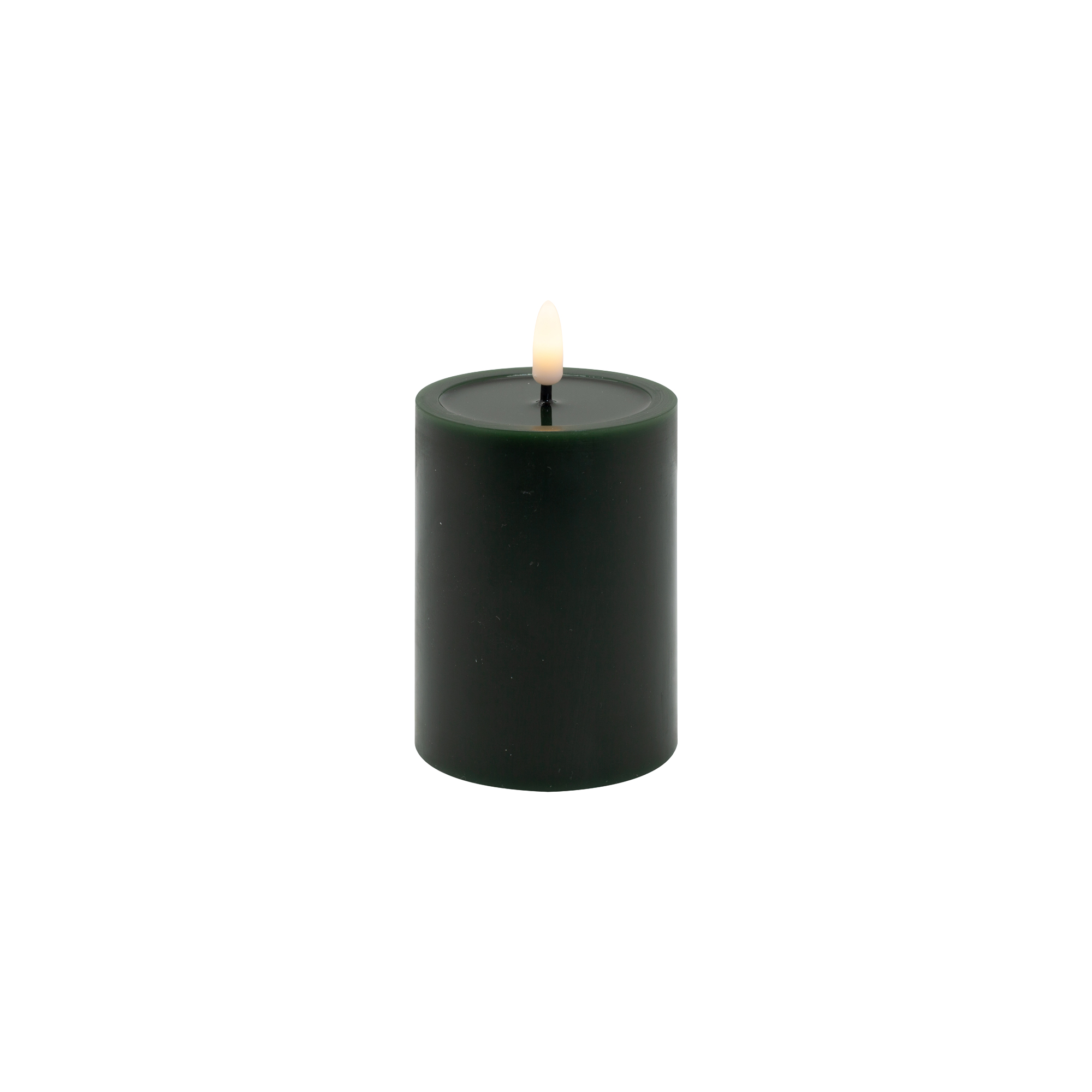CANDLE DK. GREEN 3″X4″LED WARM WHT. FLICKERING, CONCAVE TOP MELTING EFFECT SMOOTFINISH B/O 2AA W/TIMER