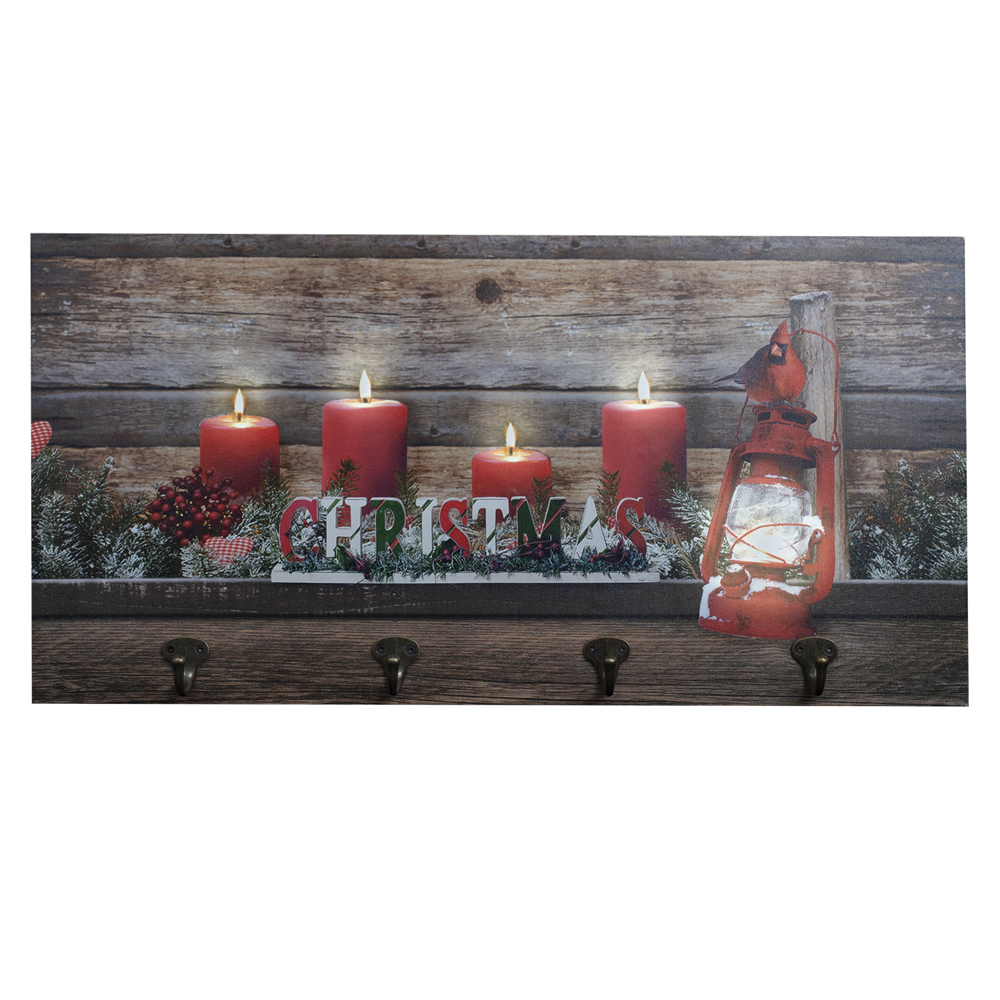 CANVAS 24″X12″ 5LED RED CANDLES AND LAMP W/4 COAT HOOKS BF