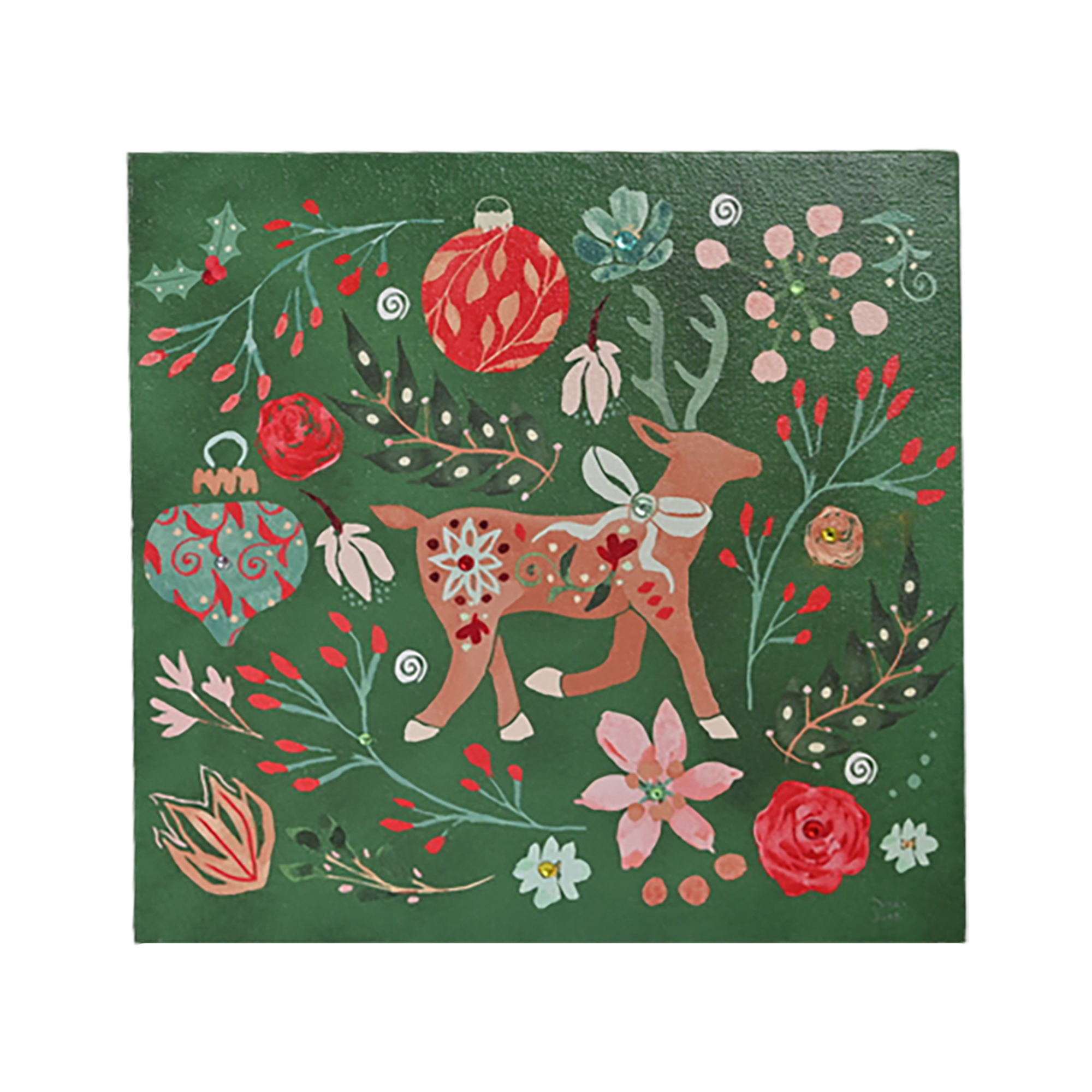 Capture the essence of a joyful holiday season with this charming piece of wall art. Featuring a playful reindeer amidst vibrant flora and festive ornaments, it evokes the warmth of family gatherings and cherished holiday traditions. The rich green background enhances the colorful illustrations, making it a delightful addition to any home.