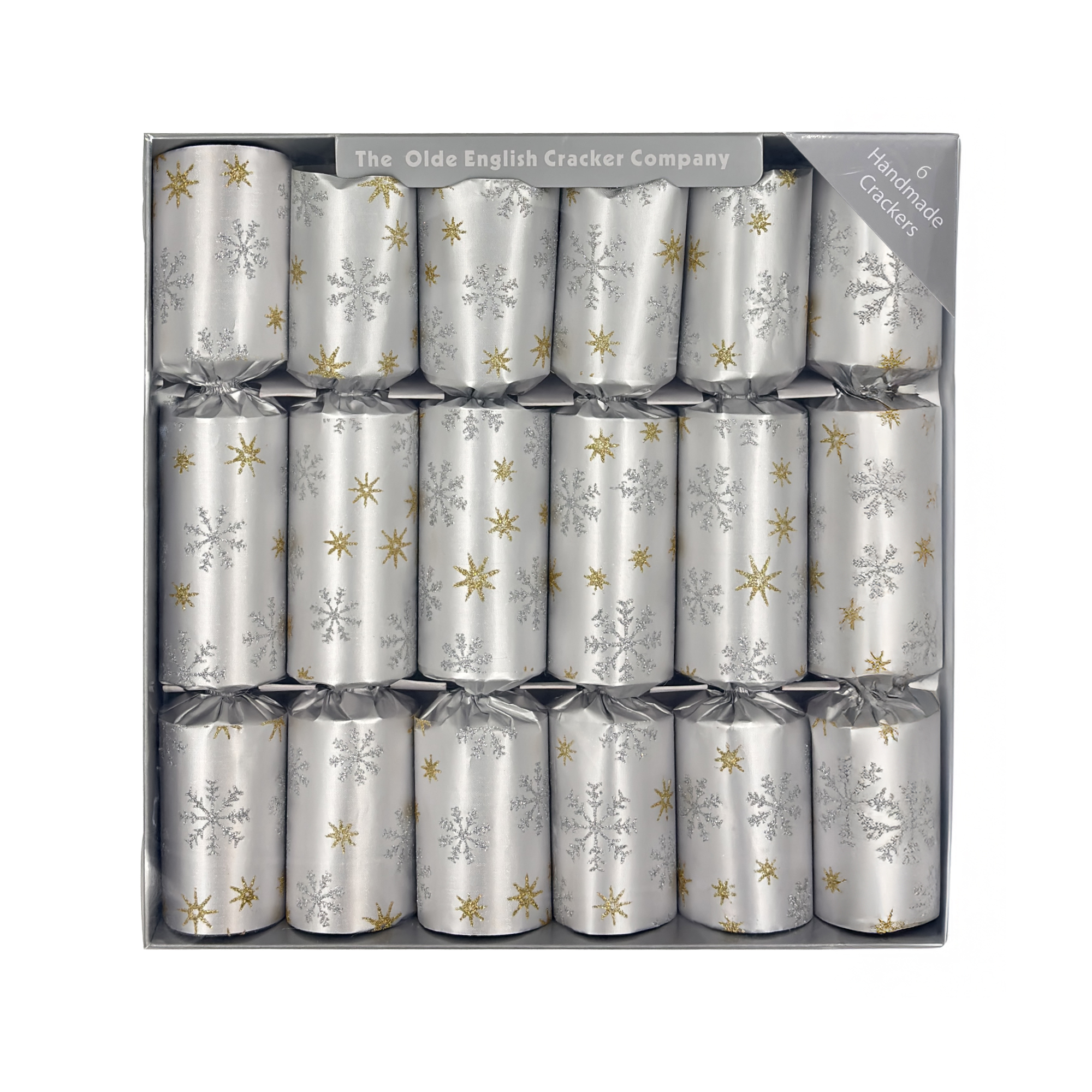 Delight in the timeless tradition of holiday celebrations with this assortment of Christmas crackers, elegantly dressed in shimmering silver and adorned with delicate gold snowflakes. Each cracker is meticulously crafted to evoke the spirit of togetherness, making gatherings memorable as laughter and surprises abound upon their festive popping.
