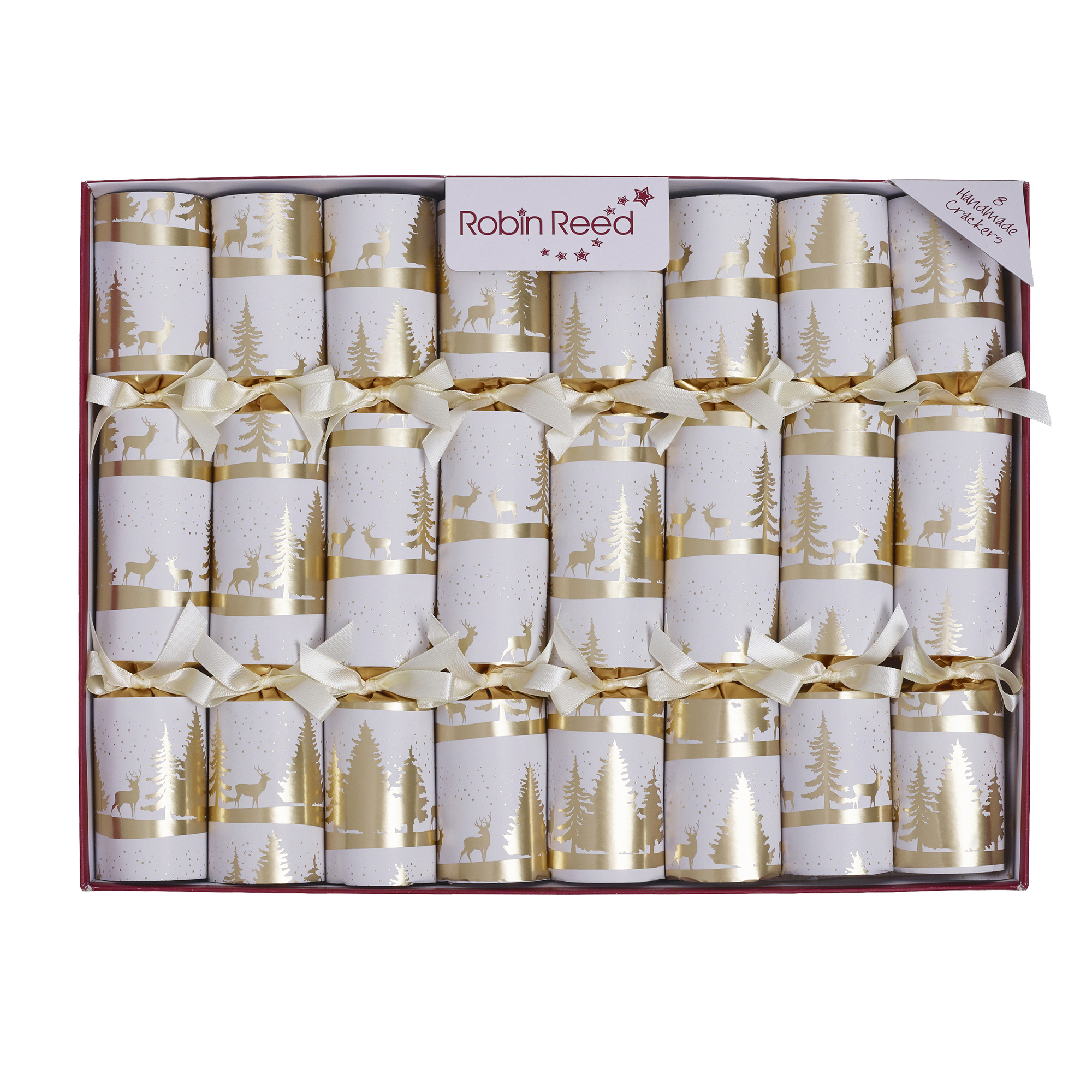 Crafted with care, this delightful set of festive celebration crackers embodies the spirit of holiday gatherings, bringing joy and surprise to your table. Each cracker features a timeless design of white and gold, adorned with elegant motifs of frosted trees, evoking the charm of a winter wonderland. Perfect for family and friends, these crackers promise to create cherished memories around your festive dining table.