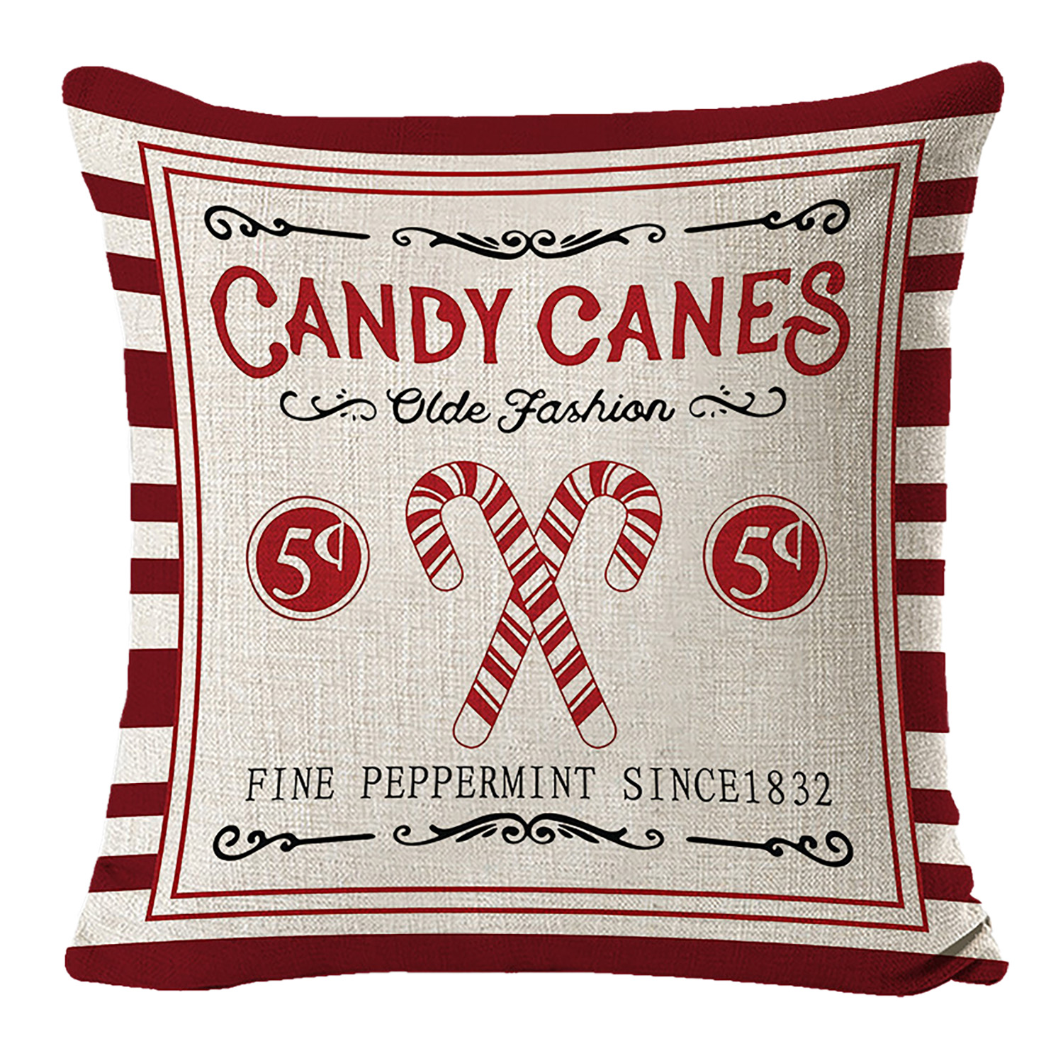 CUSHION DECORATIVE 16″x16″ “CANDY CANES” IVORY/RED