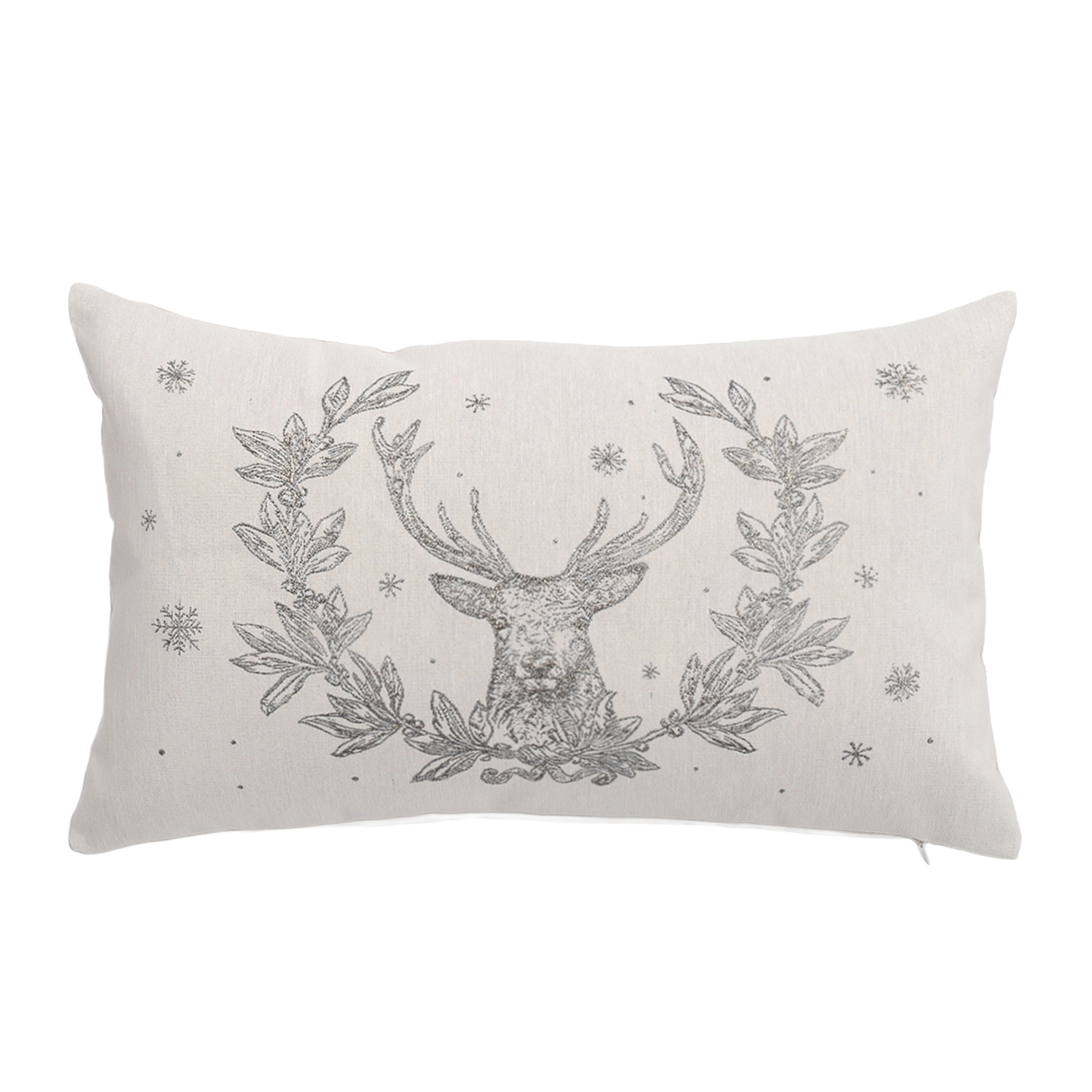 This exquisitely crafted pillow features a soft, neutral fabric adorned with a beautifully detailed design of a stag encircled by winter foliage. Its tranquil palette and elegant imagery evoke the serene beauty of a snowy forest, making it a perfect addition to your holiday home decor.