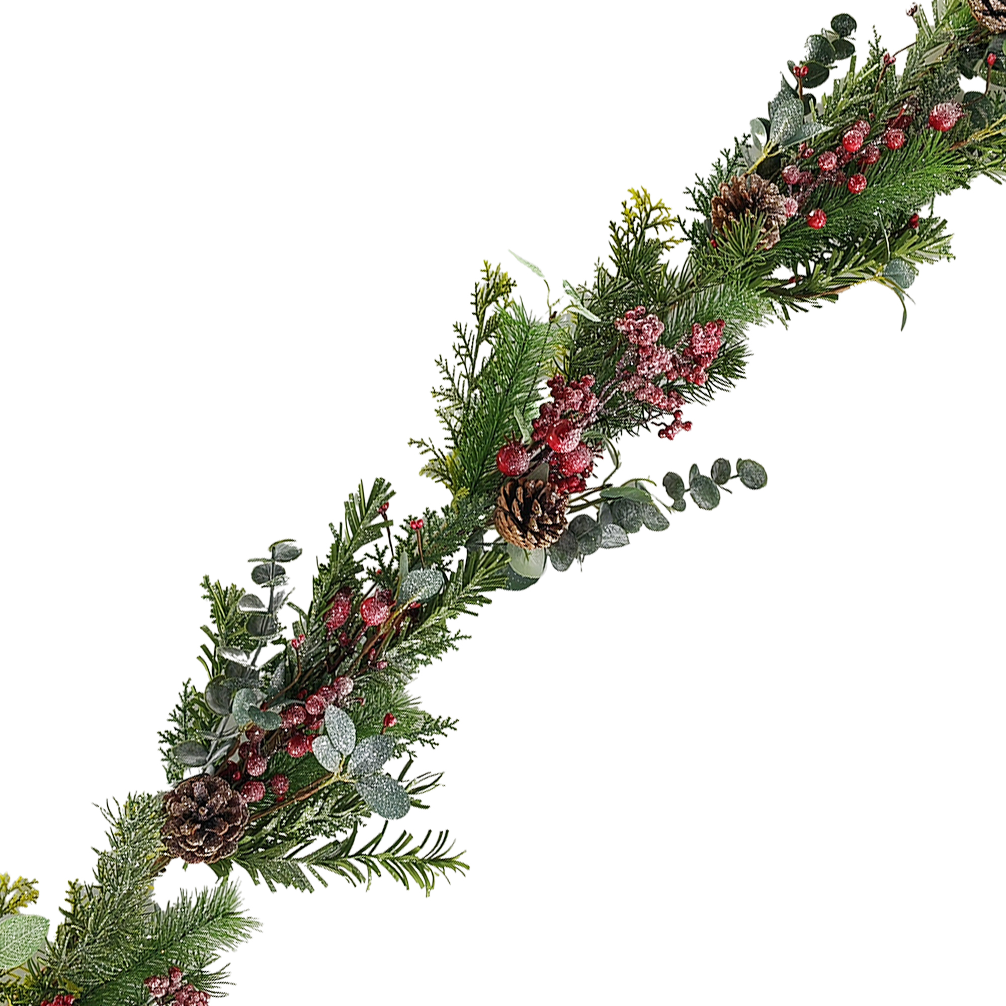 GARLAND MIXED PINE & GREENERY GREEN/RED 5′ FROSTED W/ PINE CONE & BERRIES