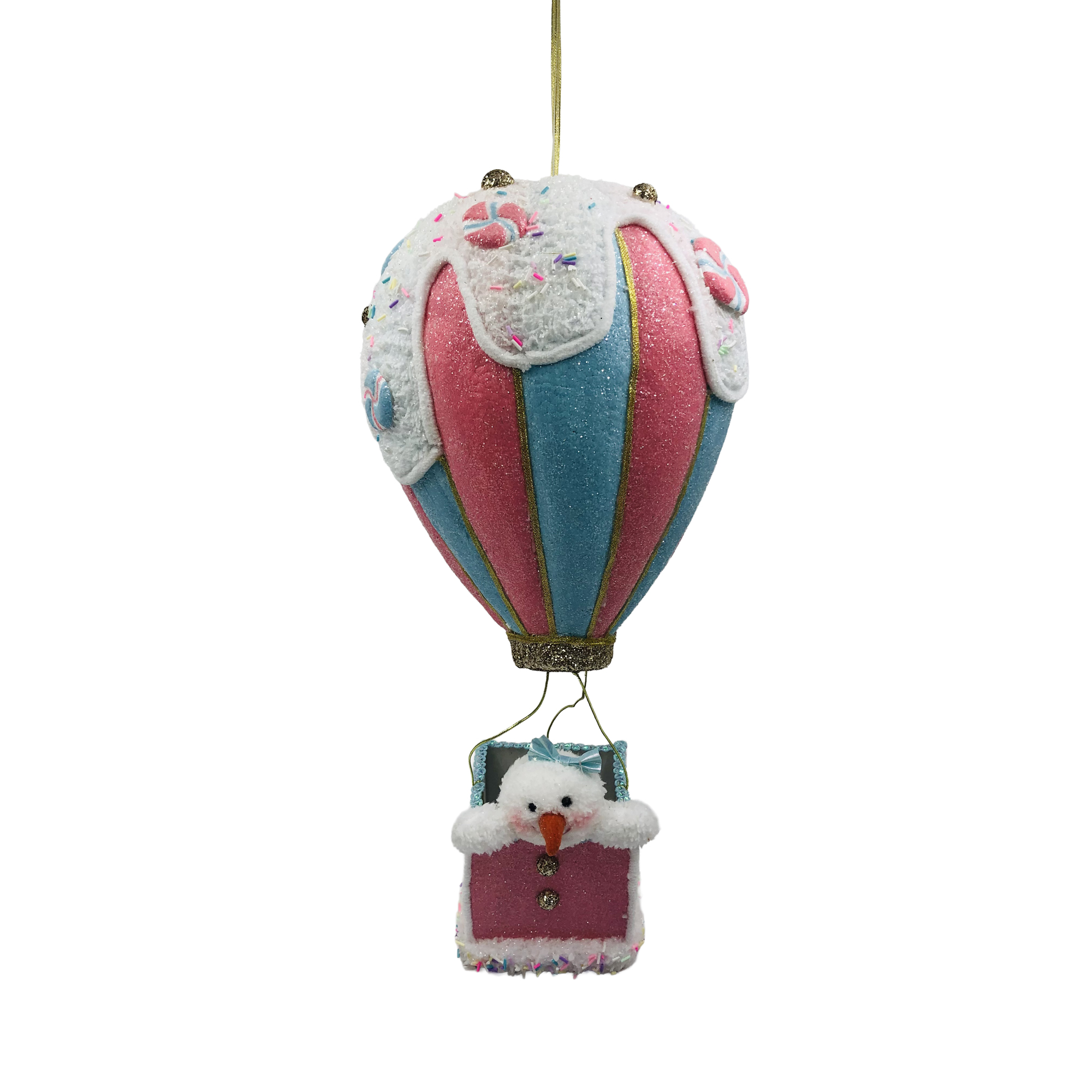 This delightful ornament captures the charm of holiday wonder with its playful design, featuring a whimsical hot air balloon in soft pastel hues. Adorned with snowy accents and a cheerful snowman in a festive gift basket, this piece evokes the timeless joy of Christmas and the nostalgia of childhood imaginations soaring high above winter landscapes.
