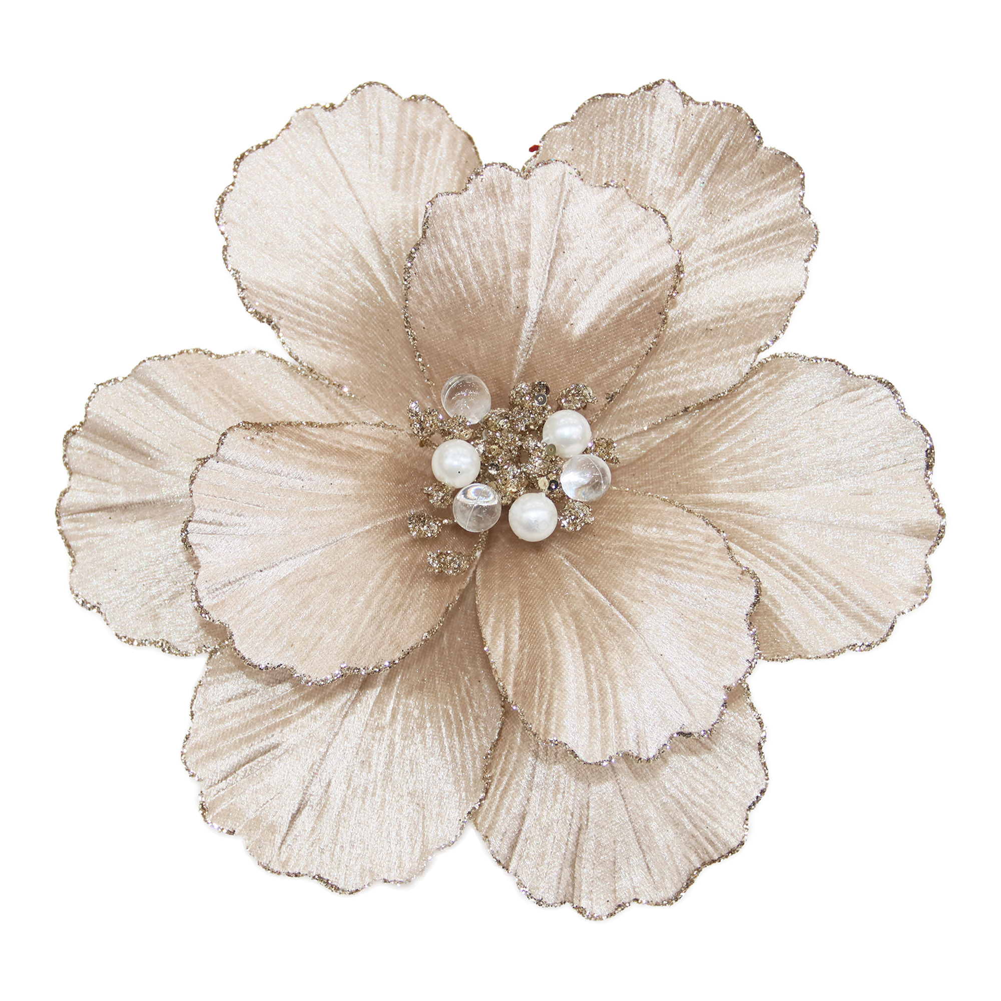 MAGNOLIA HEAD CHAMPAGNE 9″ VELVET PLEATED PETALS, BEADED CENTER & GLITTER