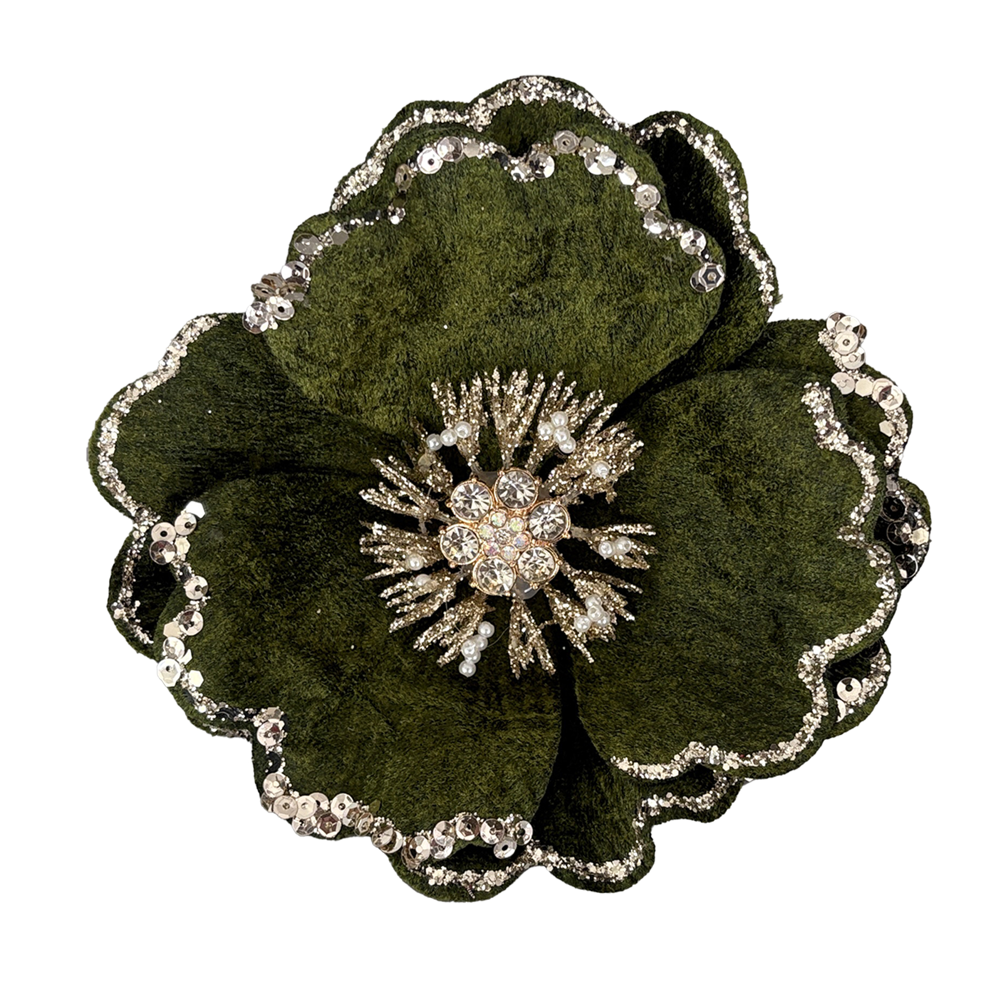 This exquisite flower decoration, with its rich forest green hue, embodies the spirit of the season with enchanting charm. Artfully crafted from soft, luxurious fabric, the delicate sequins and shimmering center add a timeless touch that evokes cherished holiday memories, perfect for adorning any festive arrangement or embellishing your favorite garments.