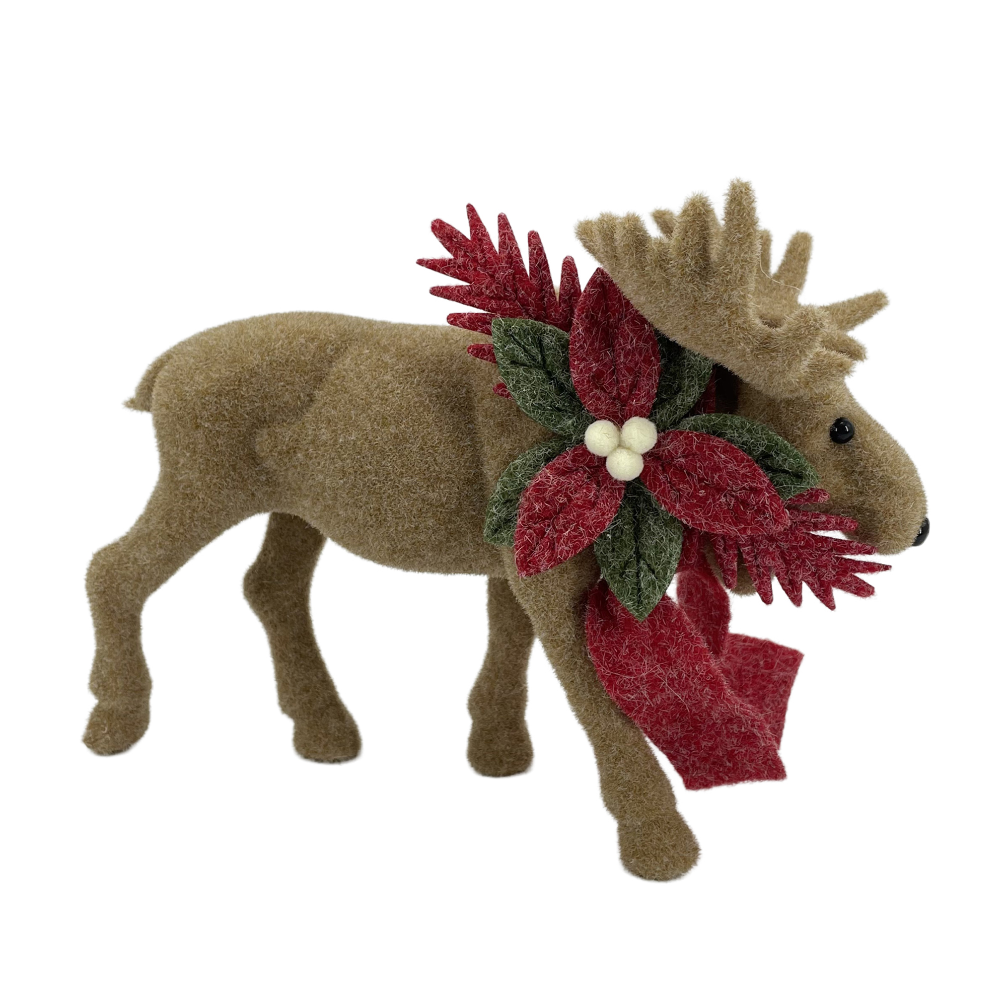 This charming reindeer brings the spirit of the season into any home with its warm, earthy color and festive decoration. Adorned with a rich, vibrant wreath of red poinsettias and soft green leaves, this piece evokes the nostalgia of winter afternoons spent gathering for family traditions. Crafted with exquisite attention to detail, it serves as a delightful reminder of the joy and warmth of the holidays.