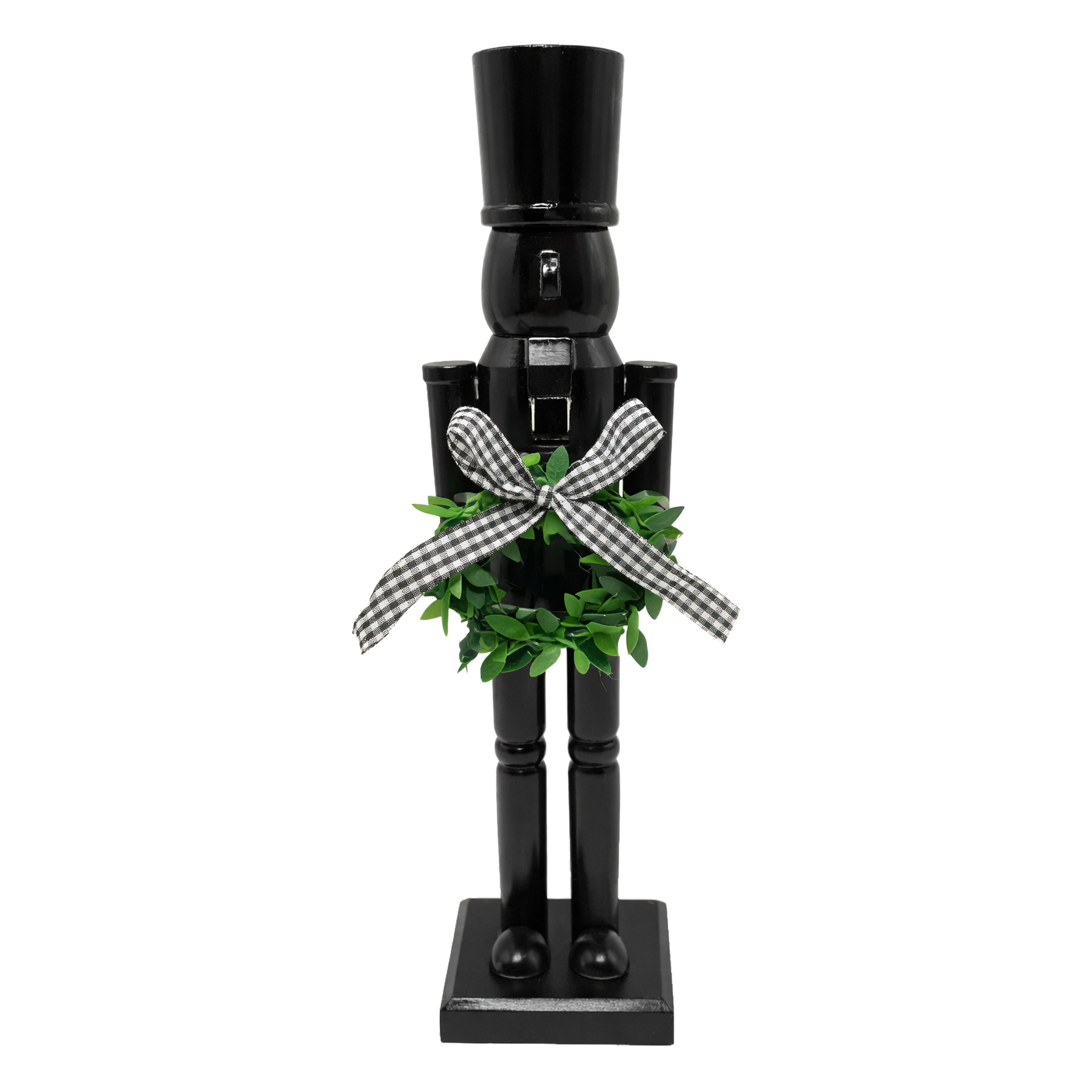 This charming nutcracker soldier captures the spirit of the season with its classic black finish and festive detailing. Holding a small wreath adorned with a checkered ribbon, this piece evokes cherished memories of holiday traditions and celebrations. Crafted from durable materials, it stands as a timeless accent for any festive display, bringing warmth and joy to your home.