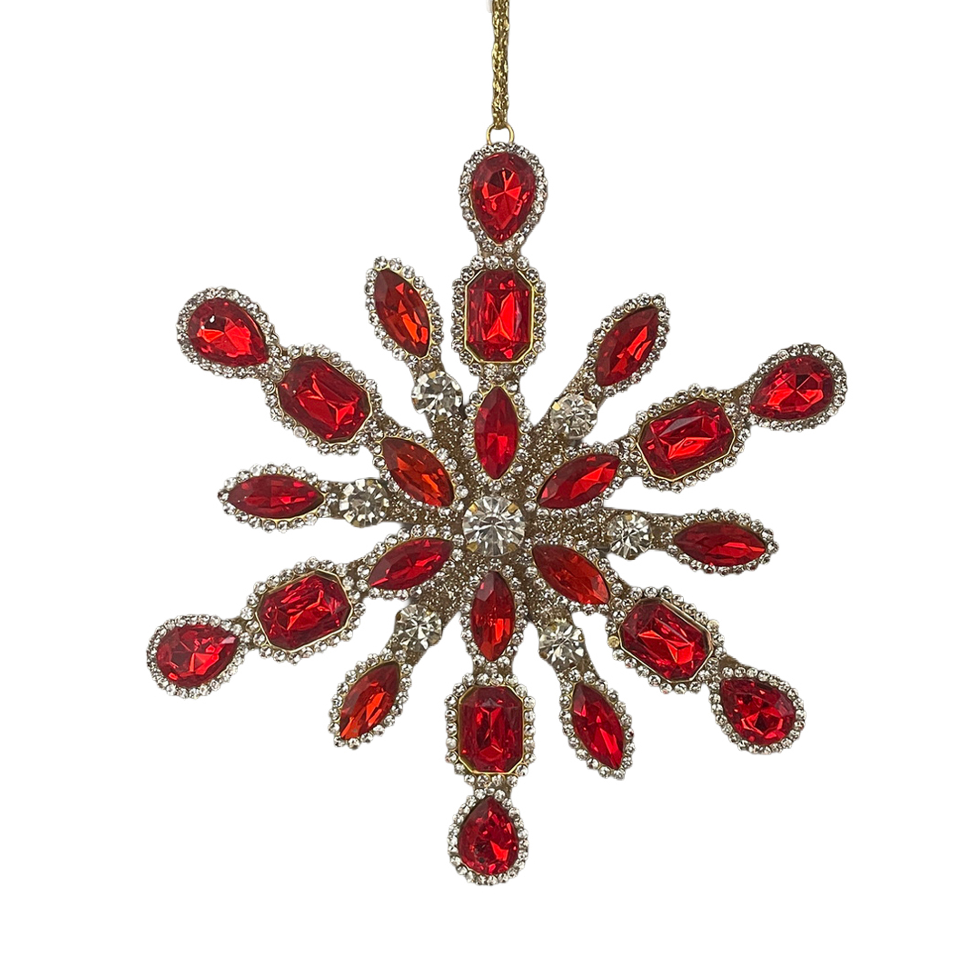 This exquisite ornament embodies the charm of a glistening winter’s day, reminiscent of gently falling snowflakes. Crafted with care, its rich red glass stones are encircled in a delicate gold-toned frame, reflecting light beautifully and adding a touch of warmth to any holiday display.