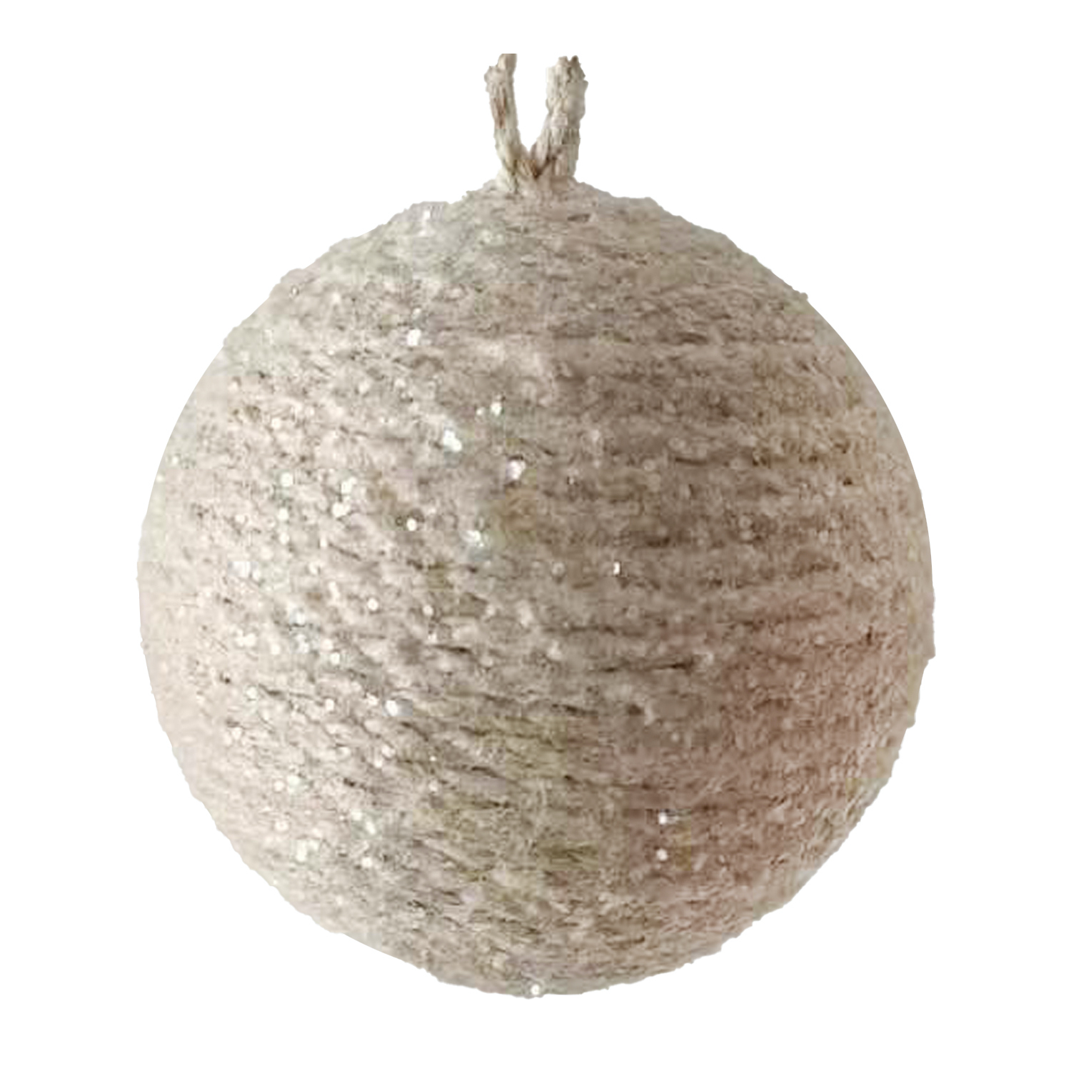 BALL FABRIC WOOL 3″ IVORY W/ ROPE & FEATHER