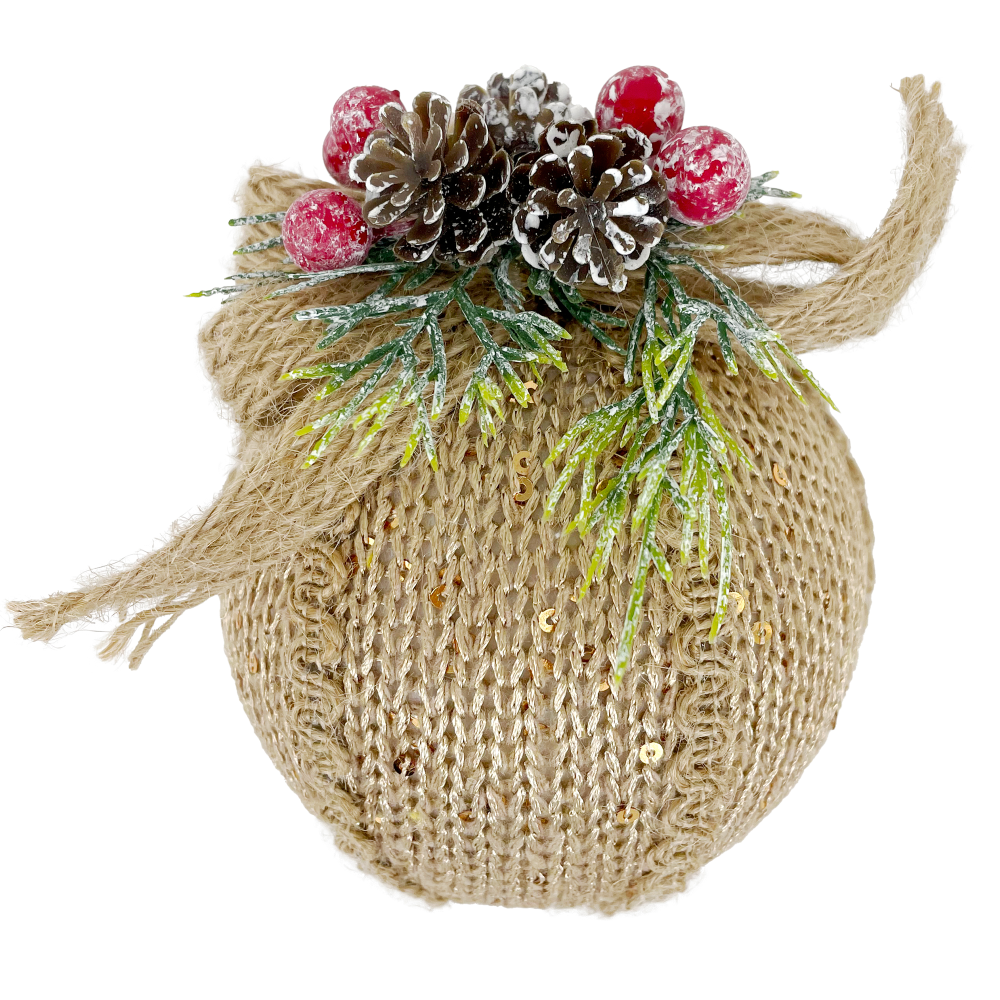 BALL FABRIC WOVEN 5″ CHAMPAGNE W/ BOW OF PINE CONE & BERRIES