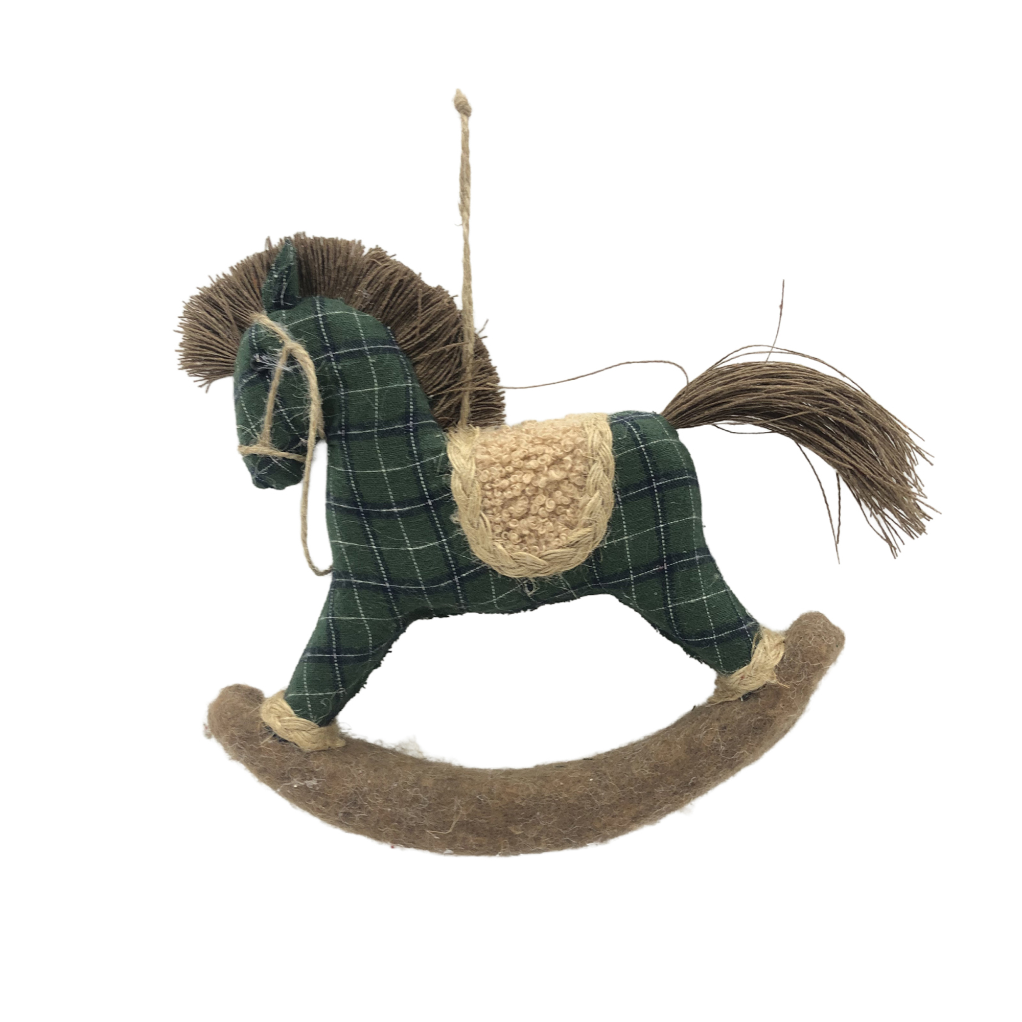 This charming rocking horse ornament captures the essence of childhood wonder with its carefully crafted design and timeless appeal. Made from soft, textured fabrics, it features a classic plaid pattern reminiscent of a cozy winter evening by the fireplace, inviting warmth and nostalgia into your holiday decor.
