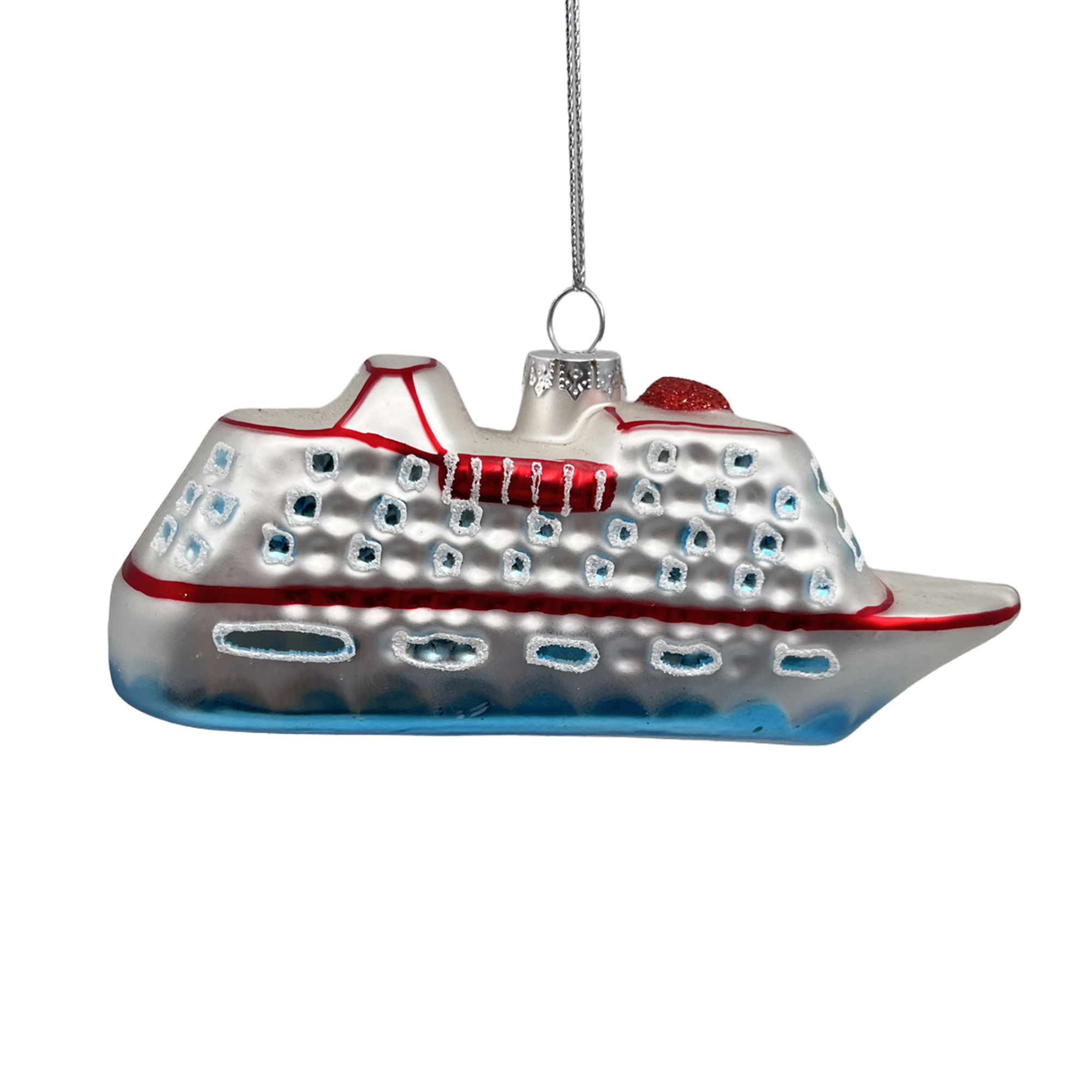 Capture the spirit of adventure and cherished memories with this delightful cruise ship ornament. Crafted from glass, its intricate detailing and shimmering finish evoke a sense of wonder, transporting you to joyful family vacations and laughter on the open seas. This piece is perfect for hanging on your tree, bringing a touch of nostalgia and warmth to your holiday festivities.