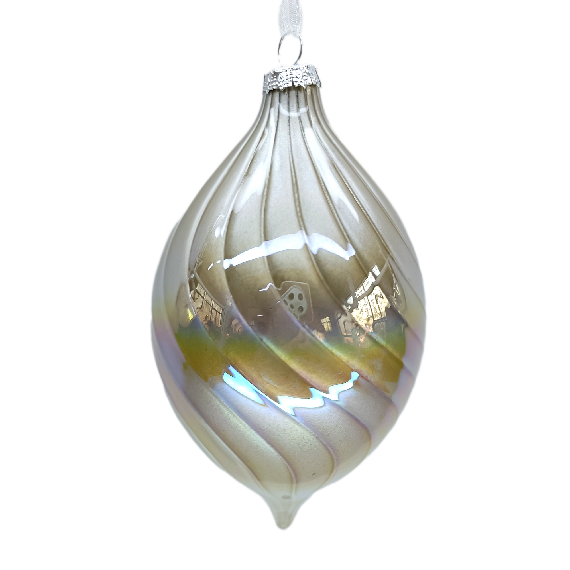 This exquisite glass ornament embodies the charm and elegance of holiday traditions. With its gently swirled, iridescent finish, this ornament captures and reflects the warm glow of twinkling lights, evoking memories of cherished family gatherings around the Christmas tree. Crafted from fine glass with a delicate craftsmanship, it is designed to be a beloved addition to your holiday decor for years to come.