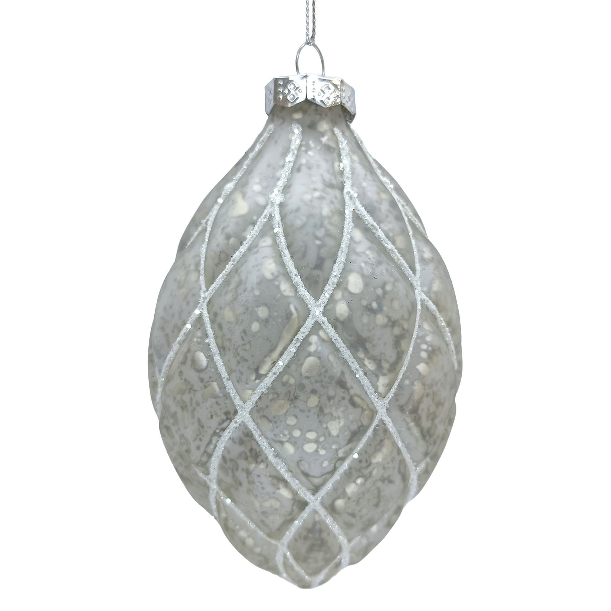 This exquisite ornament, delicately crafted in the shape of a traditional pinecone, carries the spirit of timeless holiday gatherings. Its lustrous silver sheen and graceful diamond pattern evoke sentiments of frosted winter mornings, making it a cherished piece for your festive adornments that capture the warmth of family traditions.