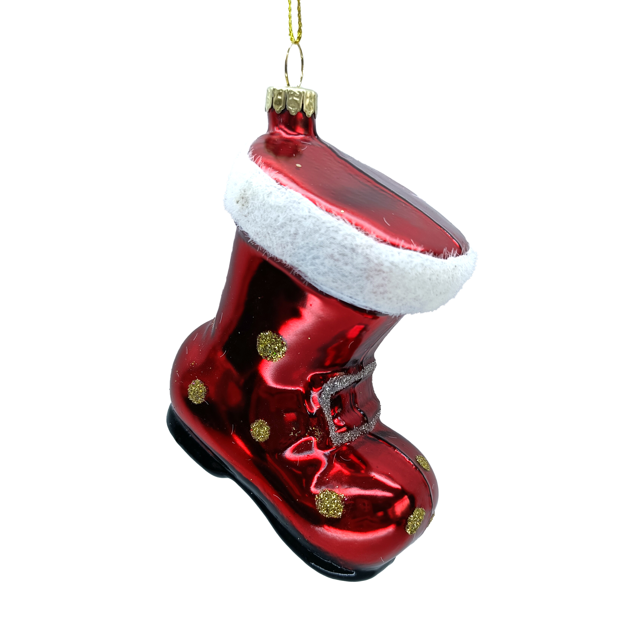 This charming ornament evokes the joyous spirit of the season, featuring a vivid red boot adorned with a fluffy white cuff and dotted with golden accents. Crafted from hand-blown glass, it captures the warmth and nostalgia of holiday traditions, making it a delightful addition to any festive tree.