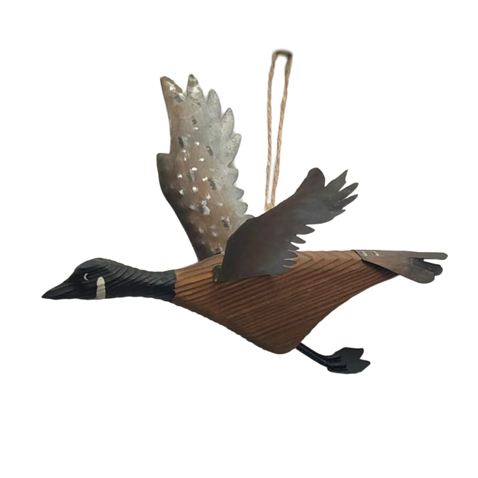 Bring the spirit of nature into your home with this lovely flying goose ornament, crafted with care to evoke cherished memories of winter flocks soaring across the sky. Made from sturdy metal and finished in warm earthy tones, this piece beautifully captures the essence of rustic holiday charm, making it a delightful addition to your seasonal decor or an inviting gift for loved ones.