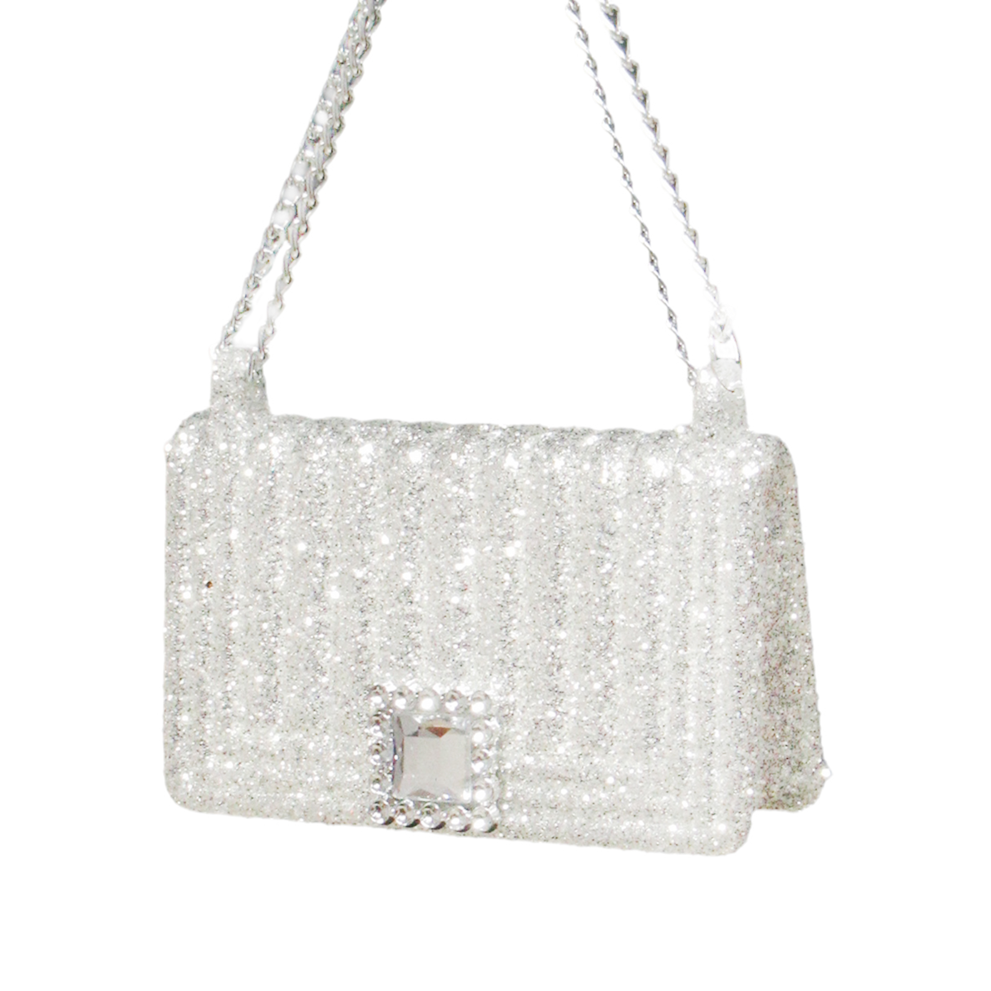 ORN HANDBAG BRIGHT SILVER SPANGLE GLITTER W/SILVER CHAIN 3.7″
