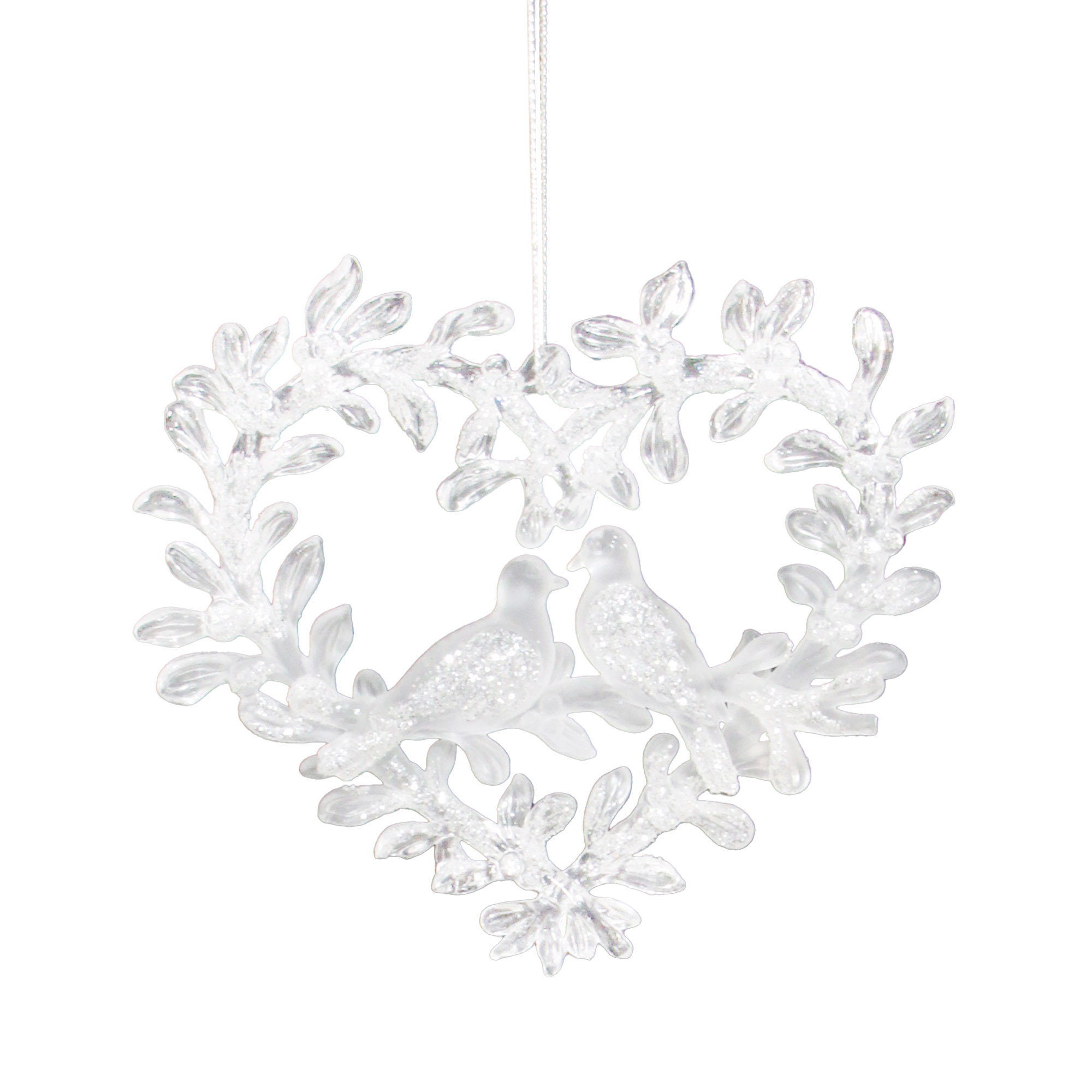 This delicate ornament, crafted in the shape of a heart, evokes the timeless beauty of love and unity during the holiday season. Featuring two graceful birds nestled among intricate, shimmering leaves, it celebrates cherished moments shared with family and friends, making it a beautiful addition to any festive arrangement.