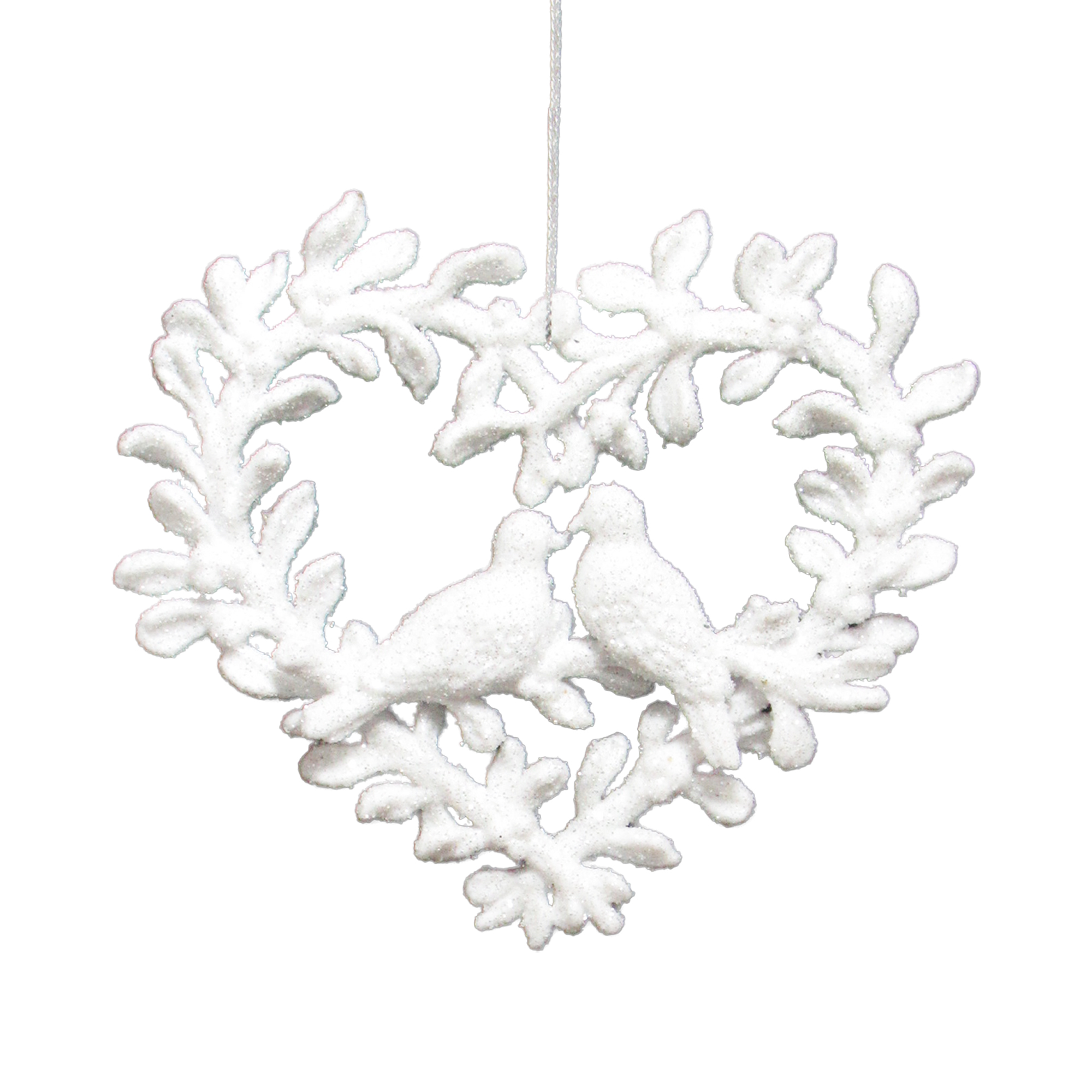 ORN HEART HOLLOW LVS 4″ WHITE W/COUPLE DOVE W/ICE WHT GLTR