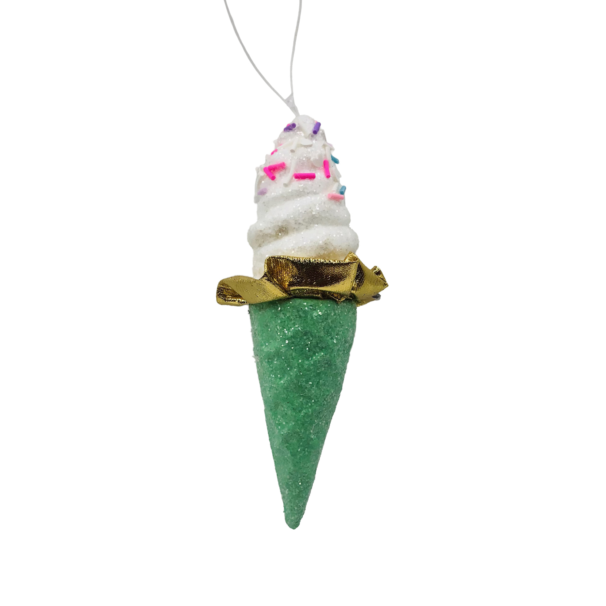 Delight in the whimsical charm of this ice cream cone ornament, a cheerful nod to the joys of childhood and festive gatherings. Crafted with care, the lush layers of frosty white represent soft whipped cream, reminiscent of winter treats enjoyed with loved ones, while the vibrant green cone adds a playful touch to your holiday décor.