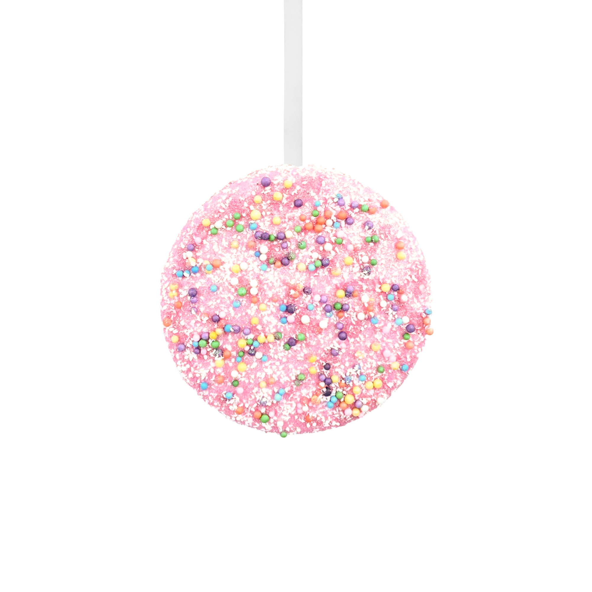 ORN MACAROON 3.5″ PINK W/ CHOCOLATE FILLING & RAINBOW SPRINKLES