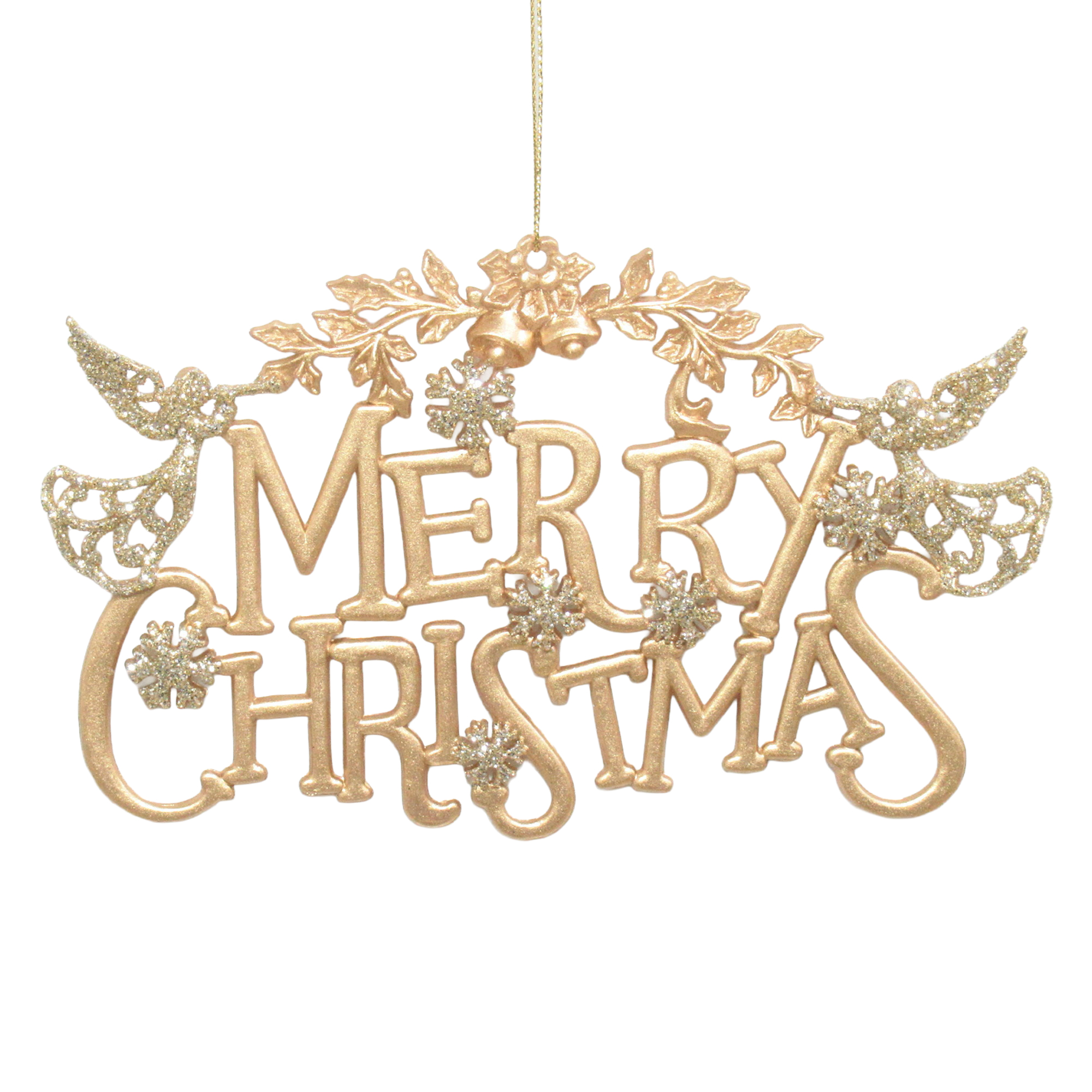ORN “MERRY CHRISTMAS” MATTE GOLD W/CHAMPAGNE GOLD GLITTER W/ANGEL, BELL & SNOWFLAKE 7.3″