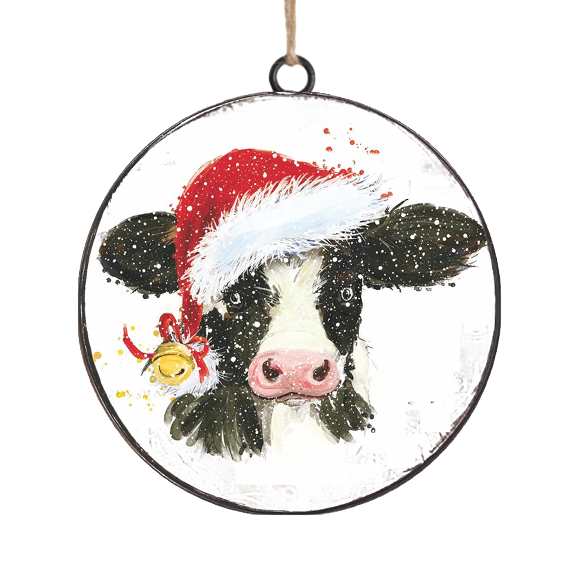 This delightful ornament captures the spirit of the season with a charming depiction of a cow adorned in a festive Santa hat. The vintage-inspired design, framed with a rustic metal finish, evokes warm memories of country holidays and family gatherings, bringing a sense of nostalgia to your decor.