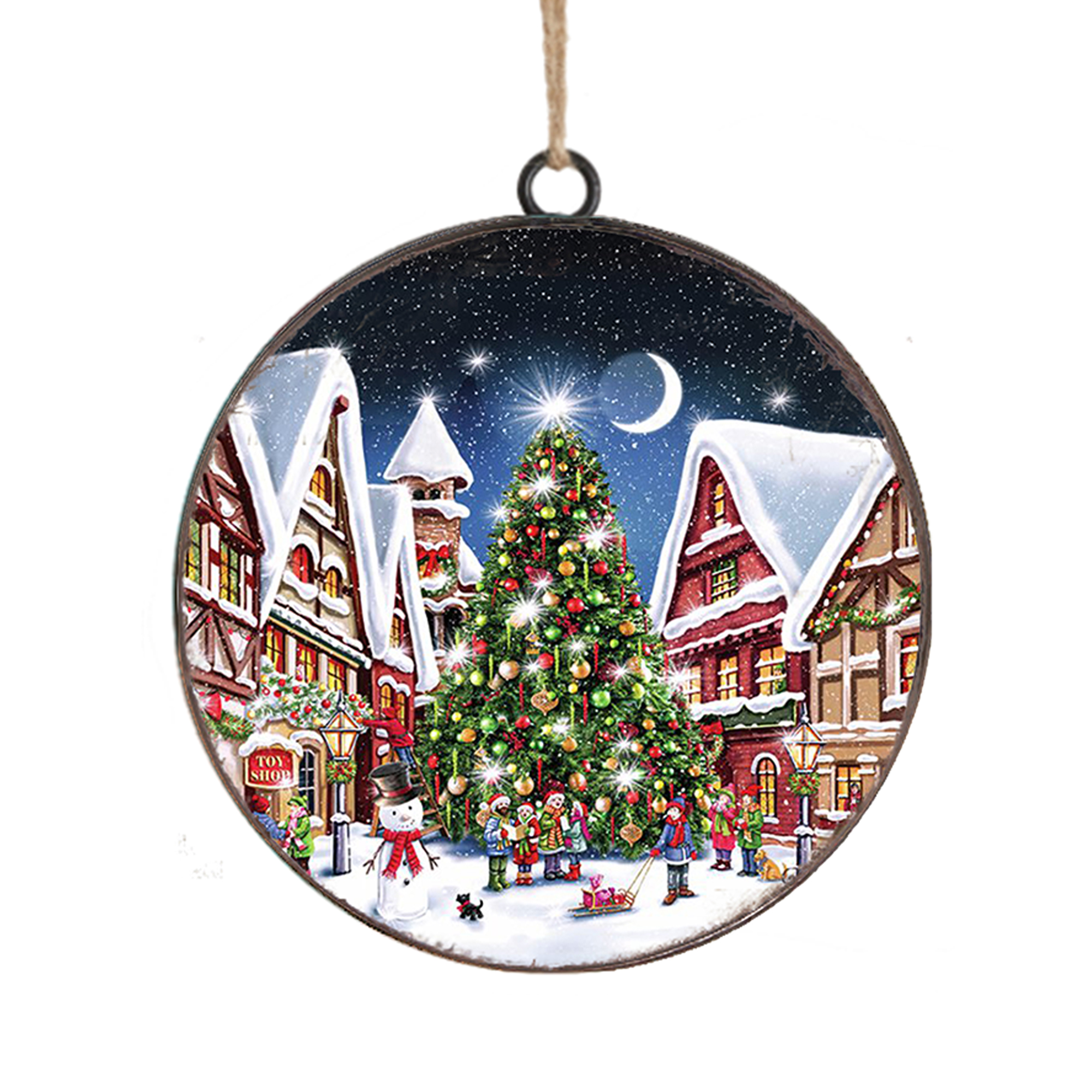 ORN METAL DISC 4″ NIGHTTIME VILLAGE WINTER SCENE