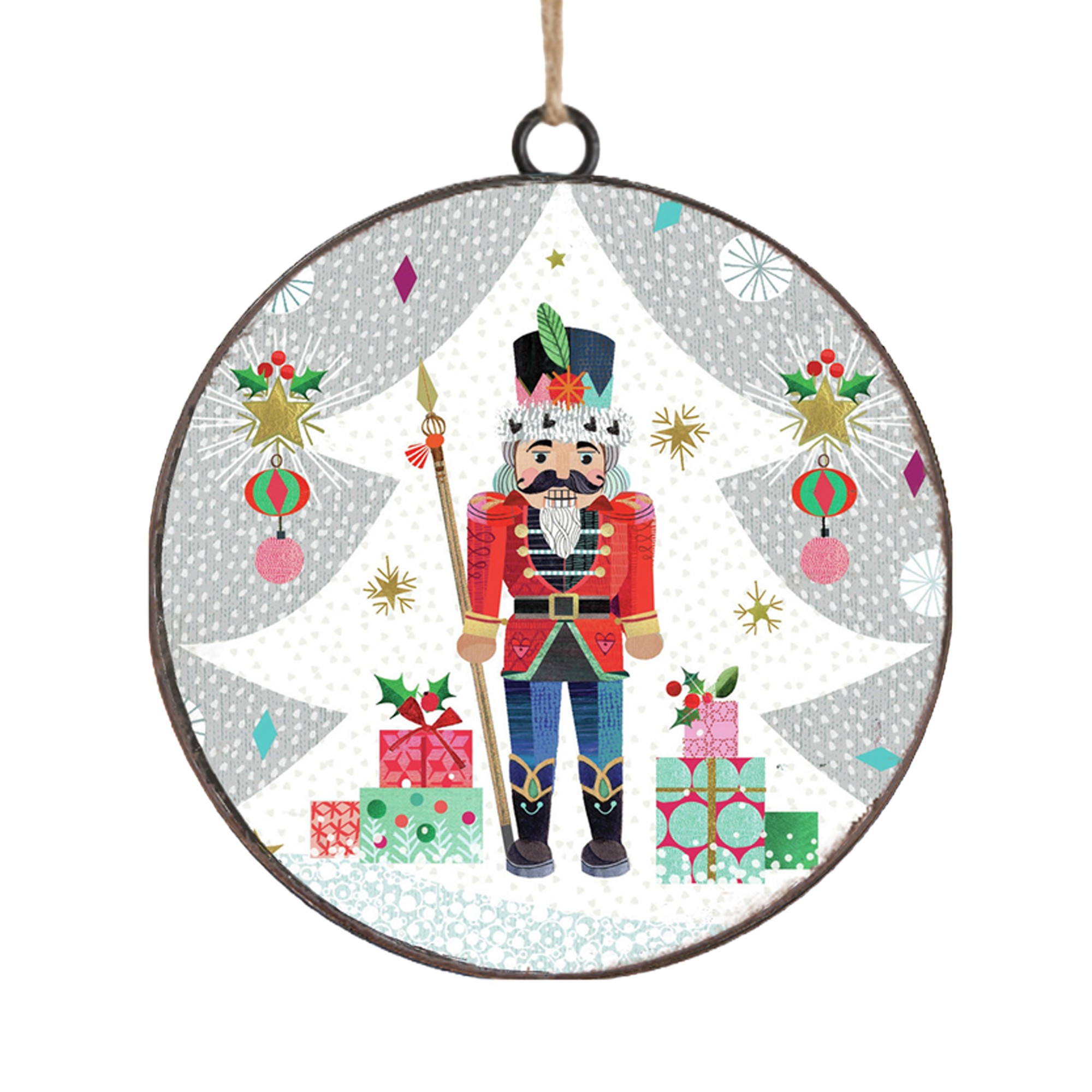 This delightful ornament captures the essence of holiday cheer, featuring a cheerful nutcracker standing proudly amidst festive decorations. With its vintage-inspired design, this piece evokes the warmth of cherished family traditions, perfect for adorning your holiday tree or enhancing your seasonal decor.