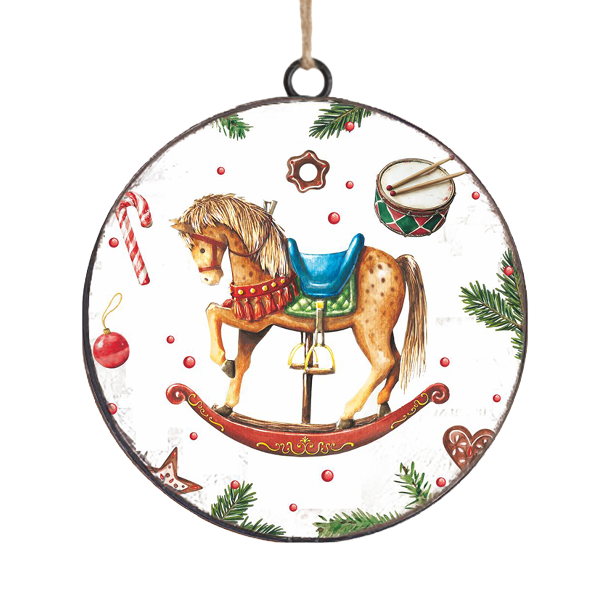 This charming ornament captures the delight of a bygone era, featuring a beautifully painted rocking horse against a backdrop of festive imagery. Each detail reflects the craftsmanship and nostalgia associated with traditional holiday decorations, evoking warm memories of childhood celebrations and joyful gatherings.