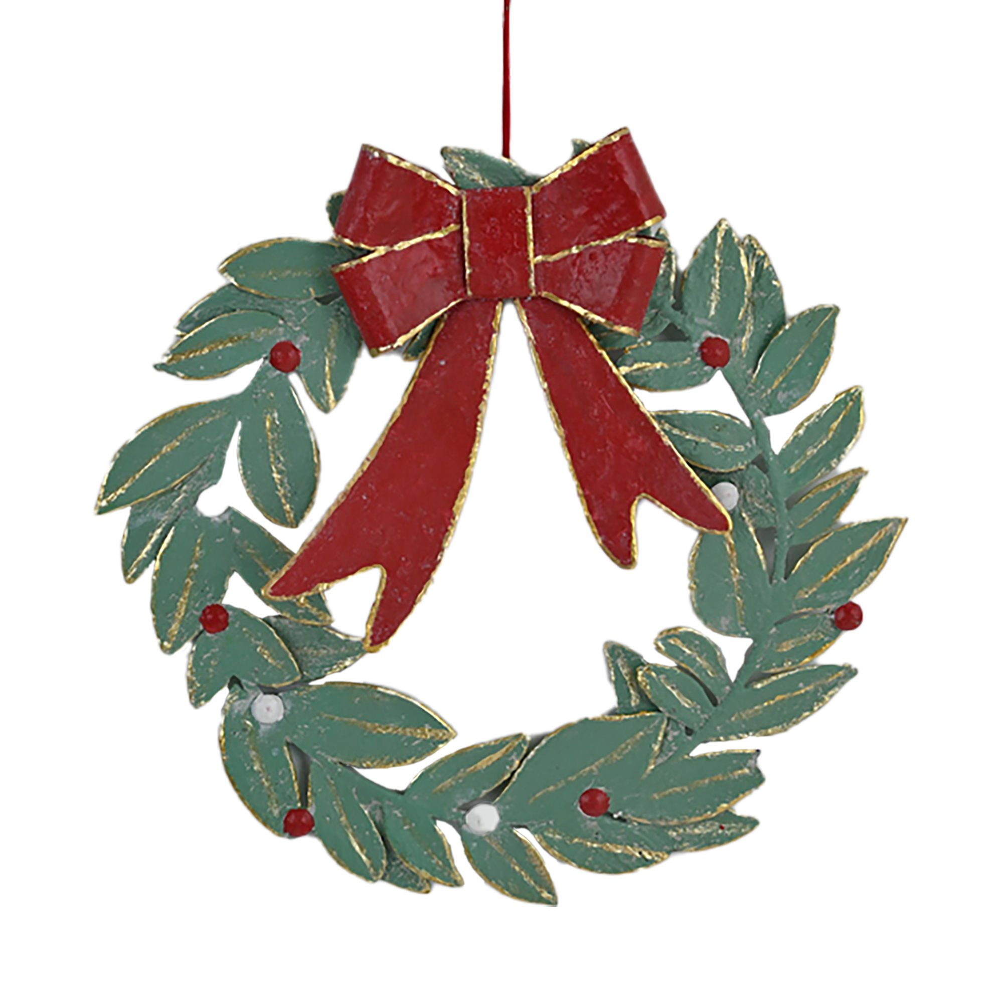 Celebrate the spirit of the season with this charming handcrafted holiday wreath ornament. Its rustic design features delicately painted green leaves accentuated by vibrant red berries and a large, cheerful bow, evoking memories of festive gatherings and cherished family traditions. This decorative piece captures the essence of warmth and joy found in every holiday home.