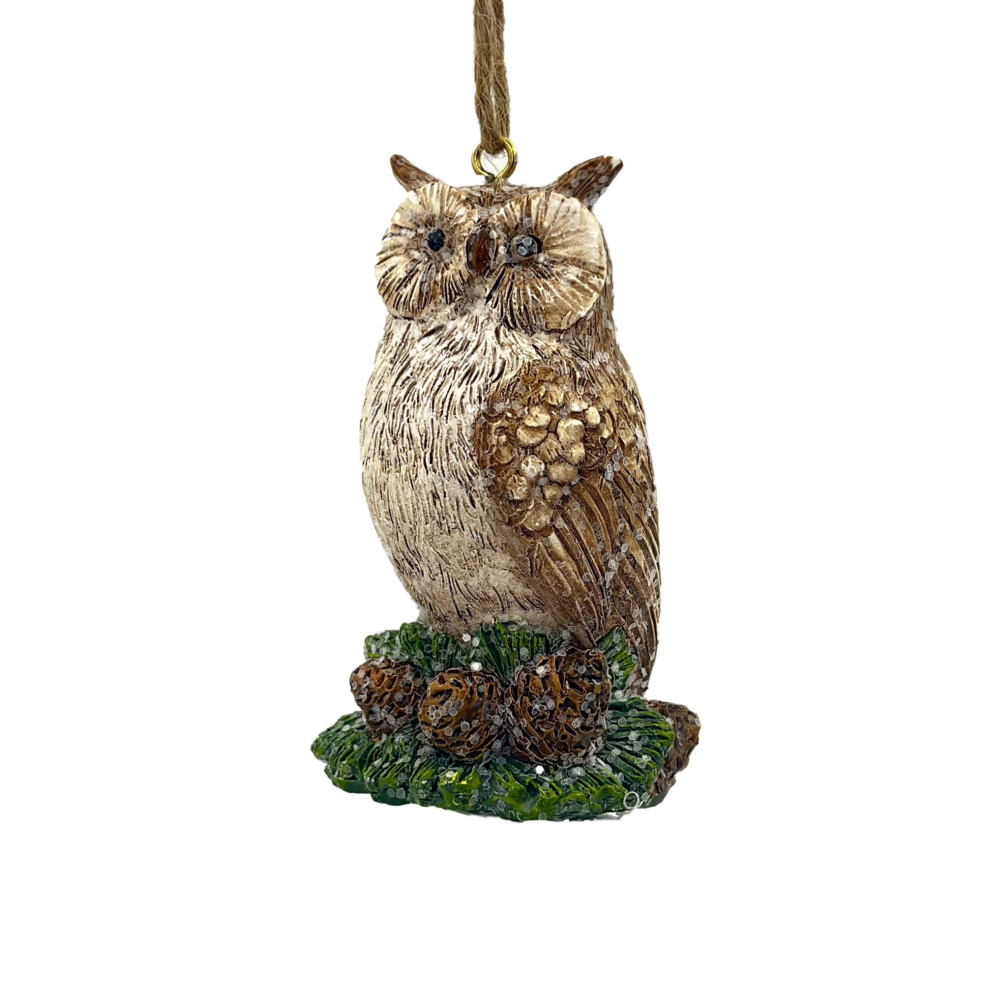 ORN OWL RESIN BROWN/NATURAL 3″ FROSTED/GLITTER W/ PINE CONE