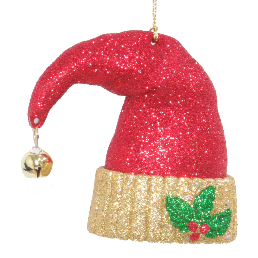 ORN RED SANTA HAT 3.25″ RED/GOLD GLITTER W/ SHINY GOLD BELL