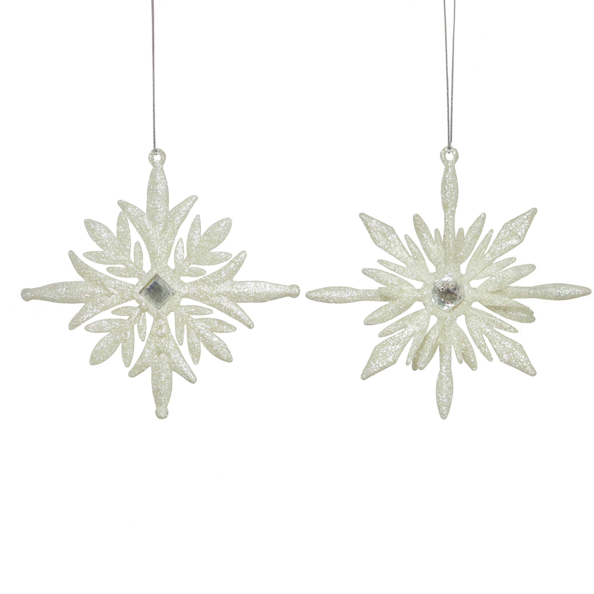 ORN SNOWFLAKE BRIGHT SILVER GLITTER W/CLEAR JEWEL 4.5″