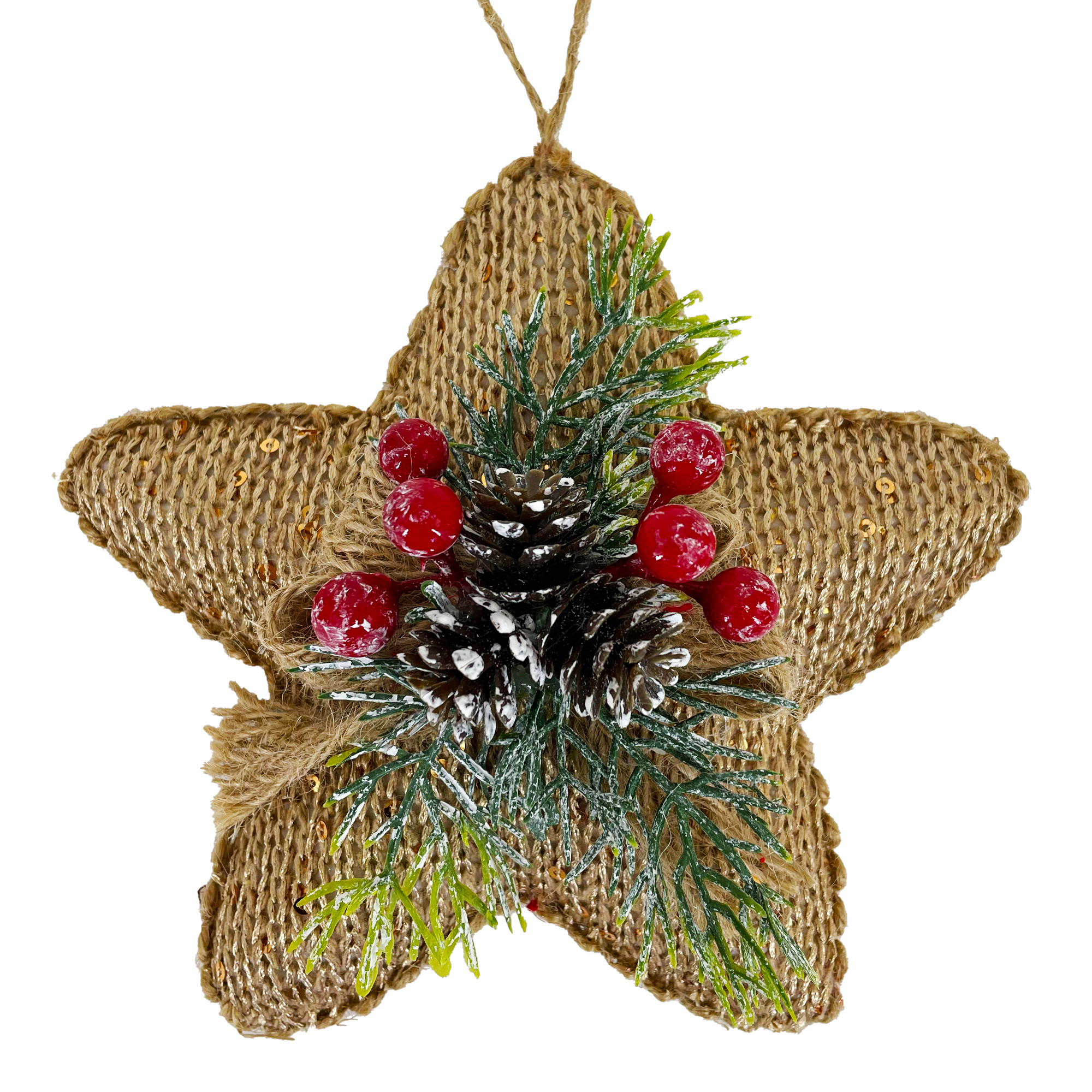 ORN STAR KNITTED FABRIC 6″ CHAMPAGNE/NATURAL W/ BOW OF PINE CONE & BERRIES