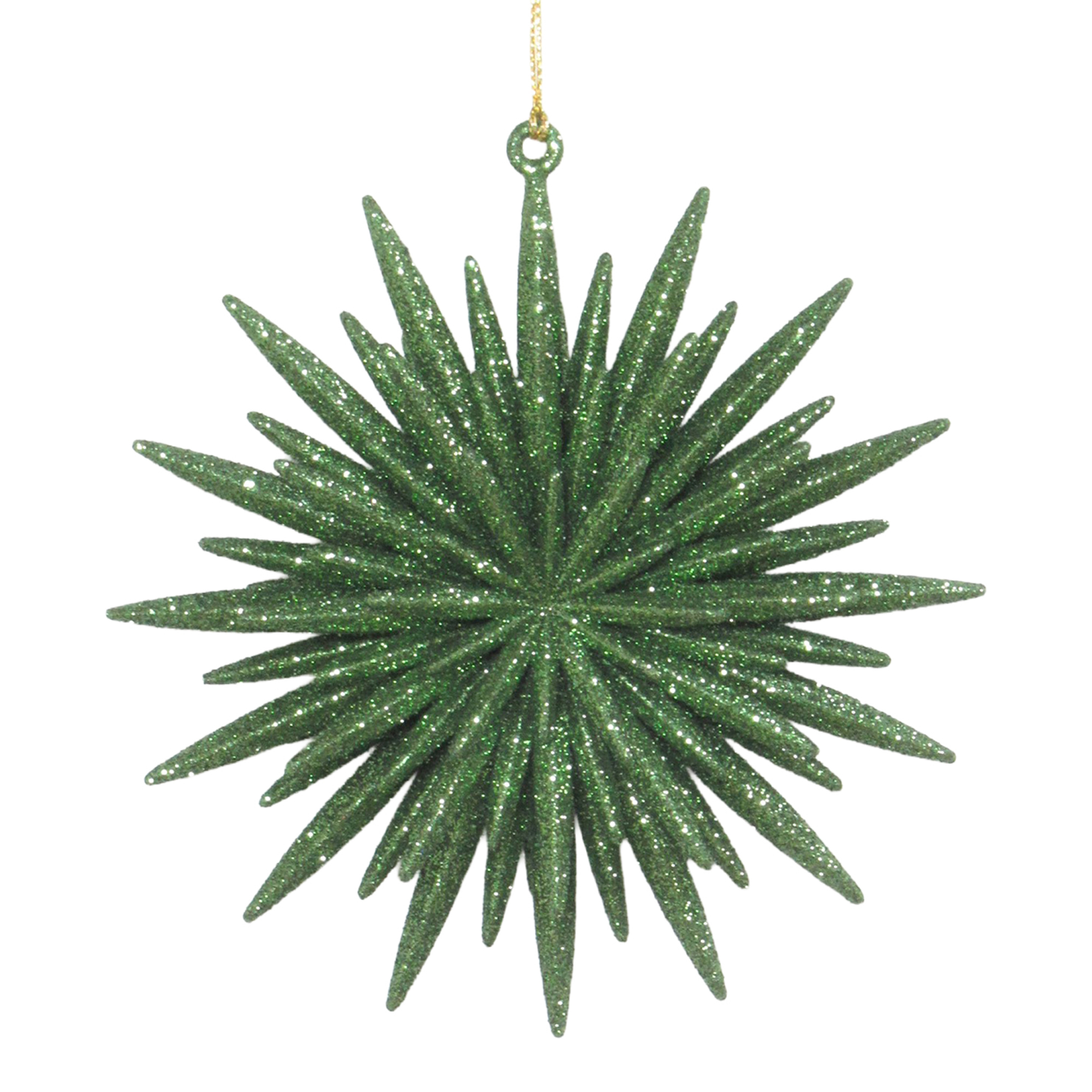 This delightful ornament captures the spirit of a winters evening, adorned with a rich green finish that glimmers with festive sparkle. The starburst design, reminiscent of classic holiday motifs, brings a touch of timeless elegance to your tree, evoking nostalgic memories of family gatherings and cherished traditions.