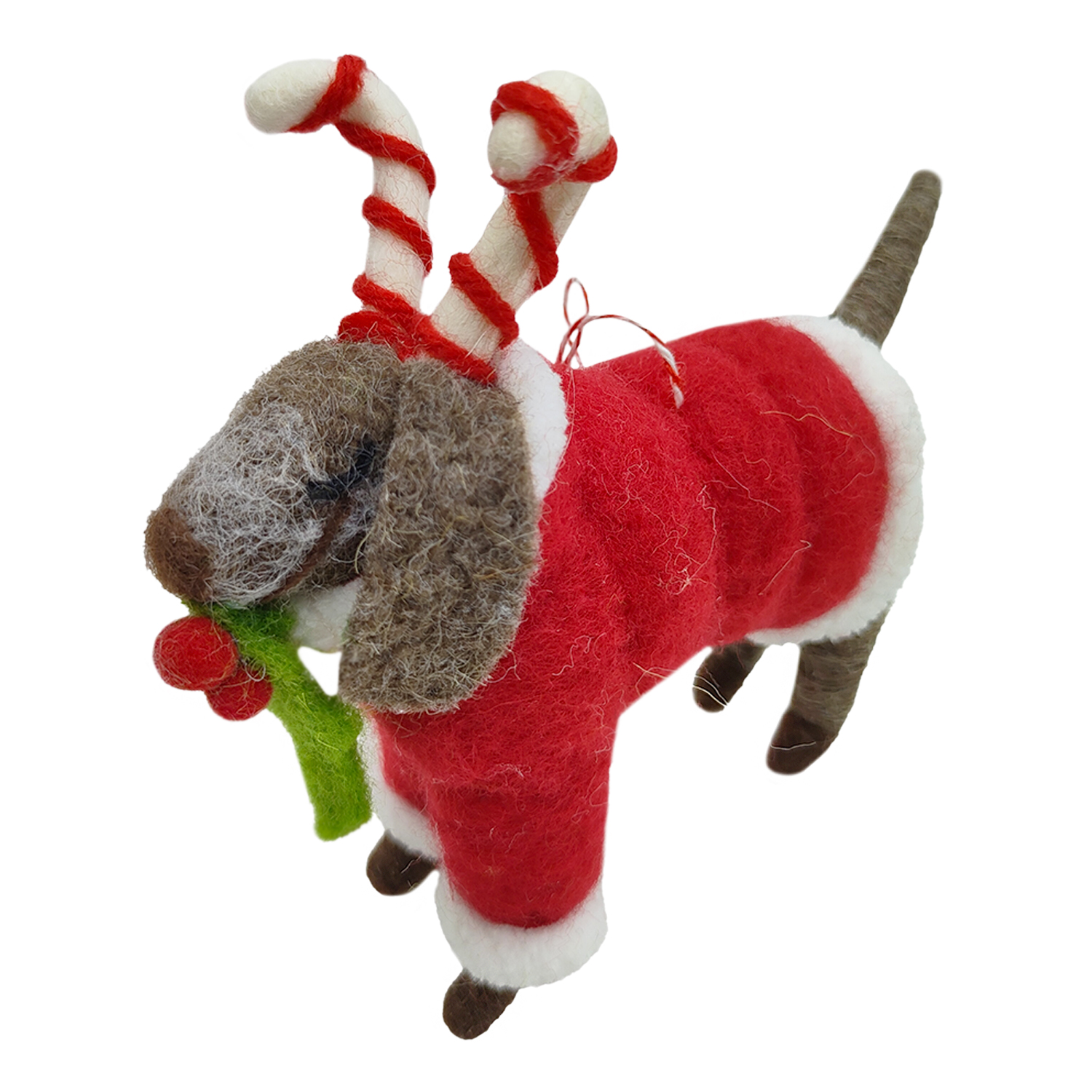 ORN WOOL DOG STANDING W/ CANDY CANE & HOLLY 4.5″ RED/GREEN