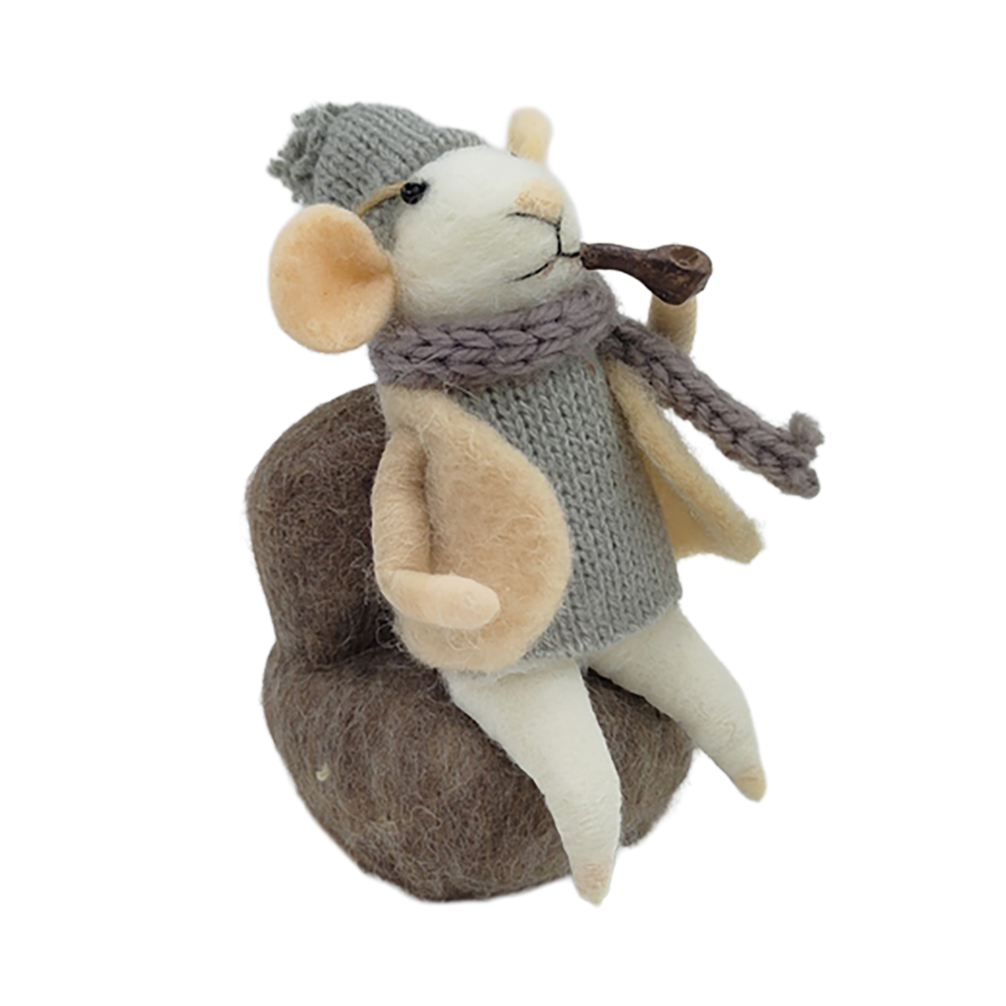ORN WOOL MOUSE 3″X4.5″ BEIGE ON SOFA W/ PIPE