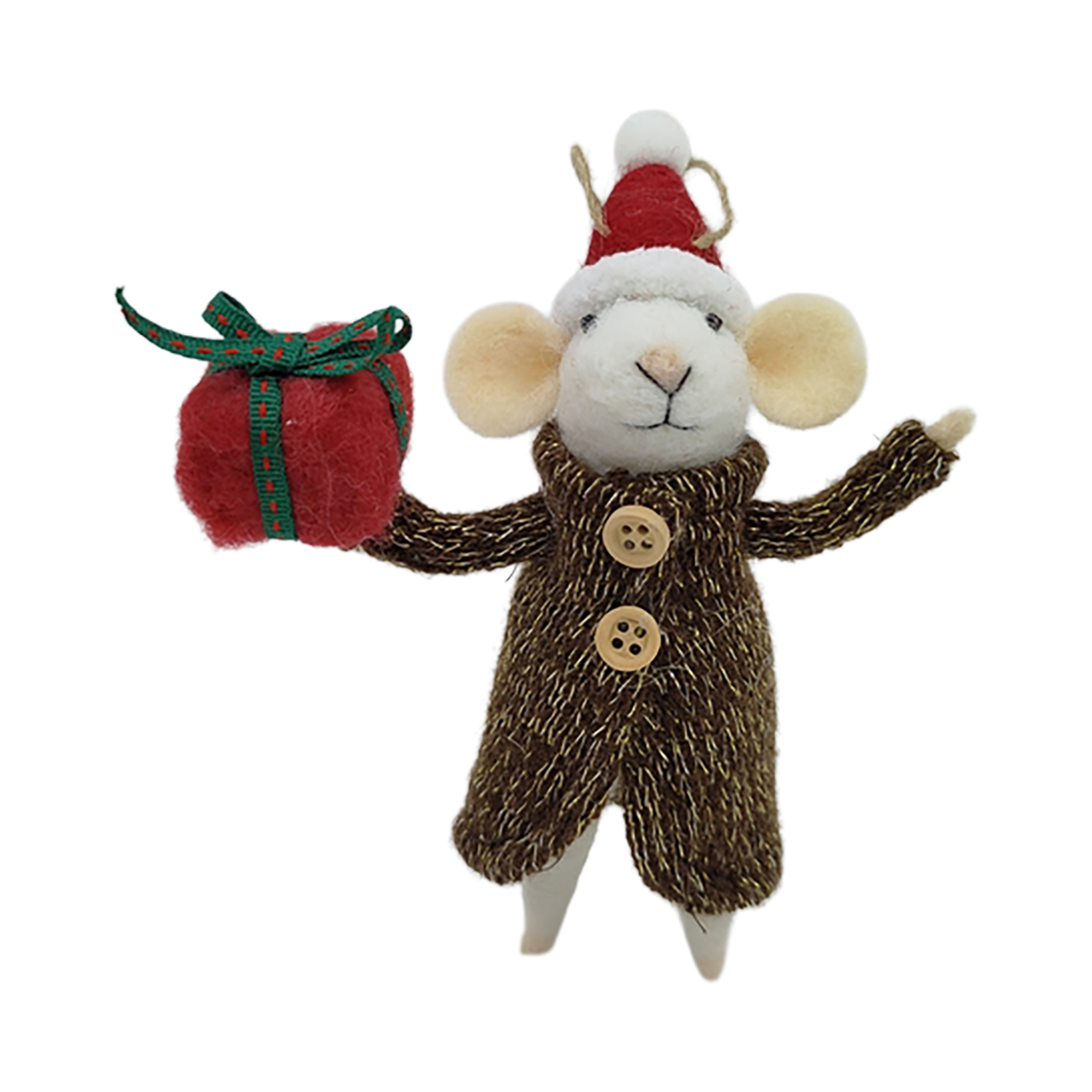 This charming holiday figure captures the essence of festive cheer and warmth, inviting the spirit of Christmas into your home. Dressed in a cozy brown coat adorned with wooden buttons and a cheerful red Santa hat, this delightful character holds a small, gift-wrapped present, evoking heartfelt memories of childhood celebrations and the joy of giving.