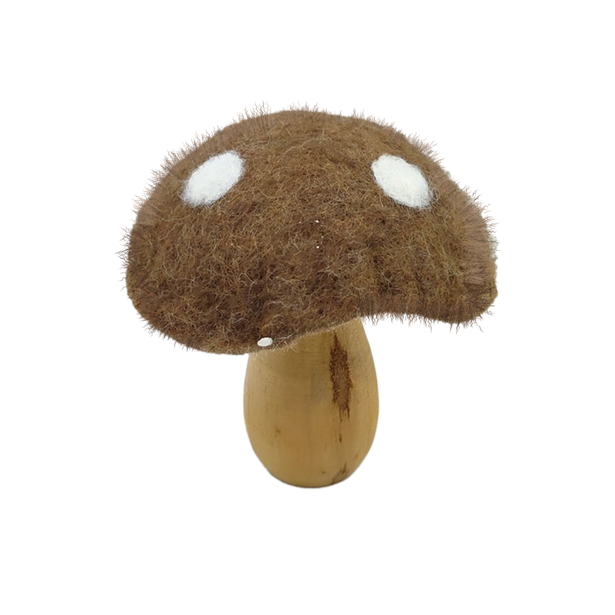 ORN WOOL MUSHROOM 4″ BROWN W/ WHITE POLKA DOT CAP & WOODEN STEM