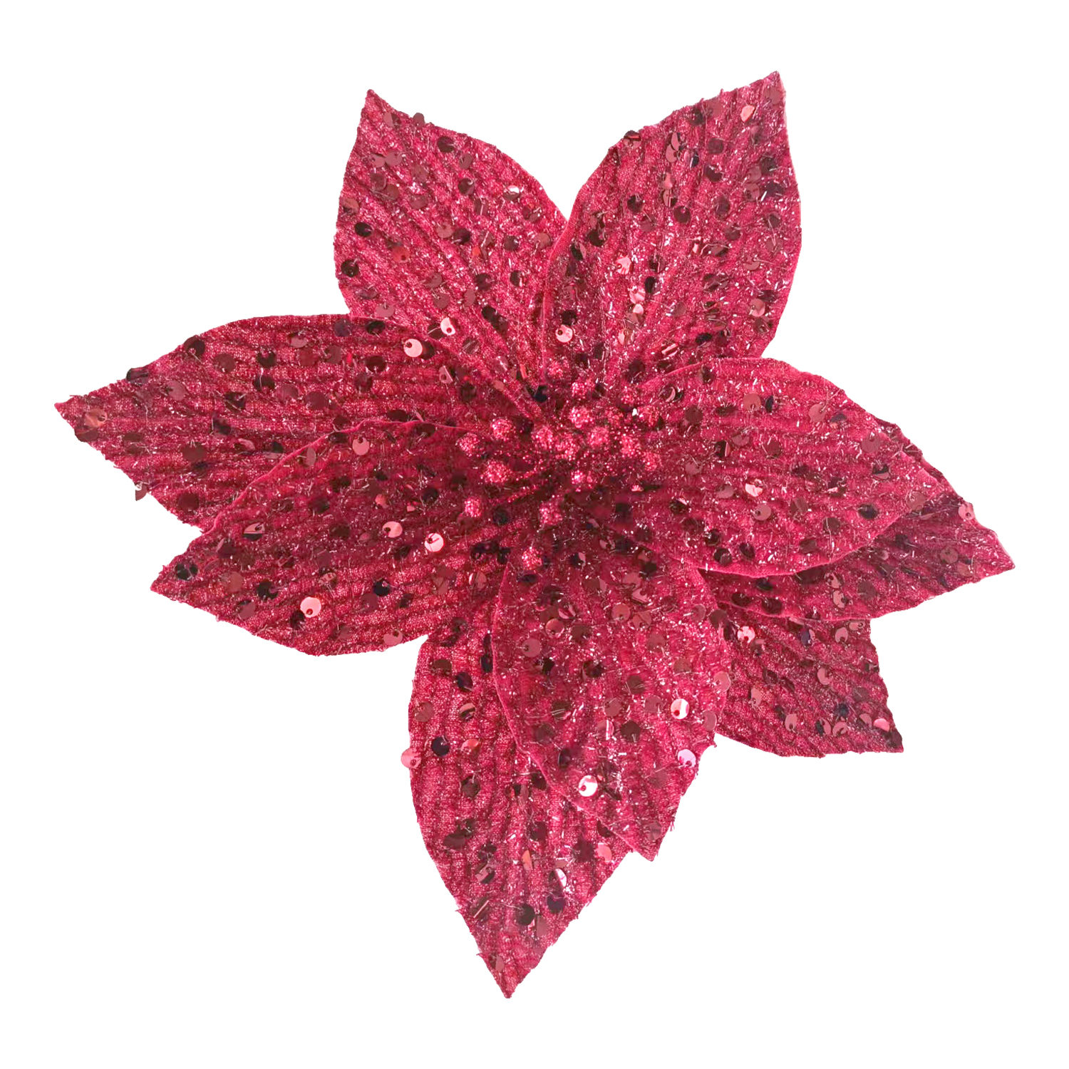POINSETTIA HEAD RED 9″ FABRIC W/ SEQUINS & CLIP