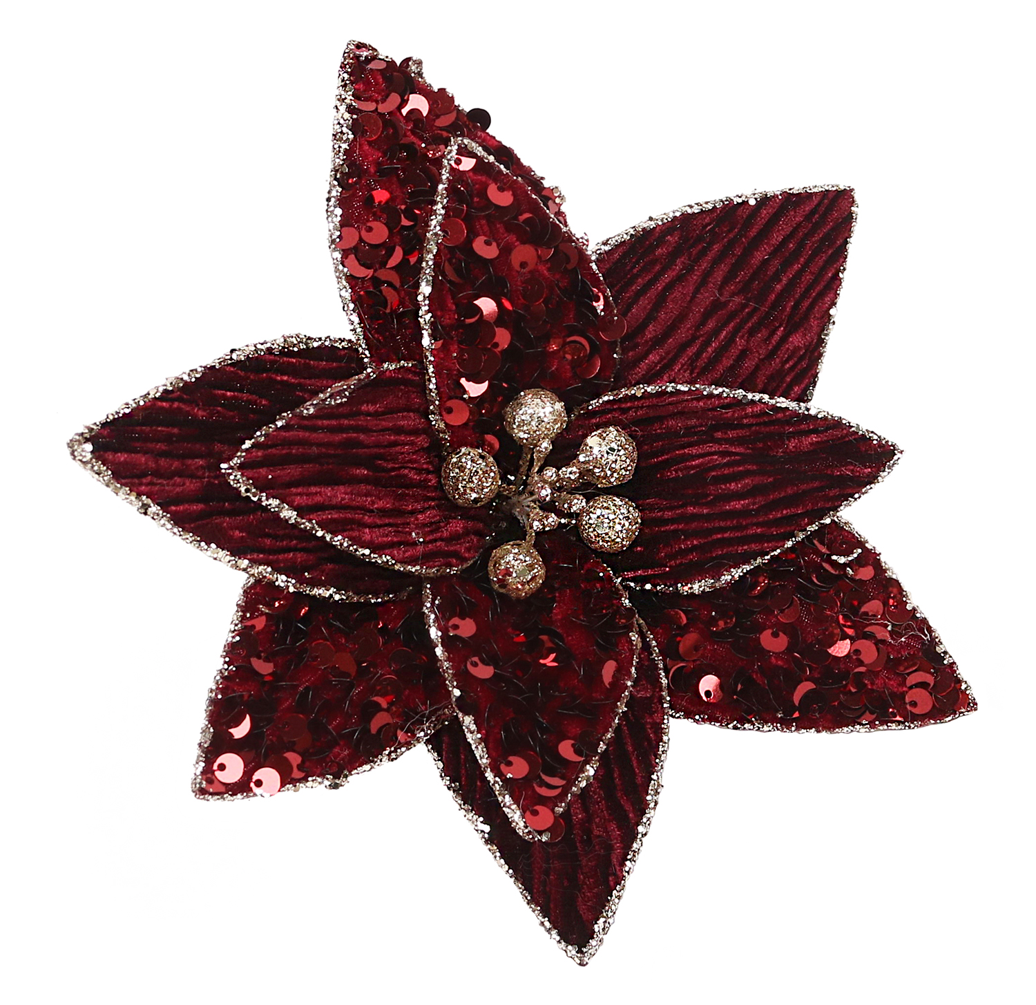 POINSETTIA HEAD BURGUNDY 7.5″ VELVET W/ SEQUIN & CLIP